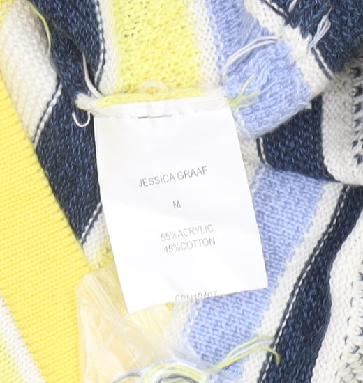 This Jessica Graaf women's jumper offers timeless style and everyday comfort. Crafted from a soft blend of 55% acrylic and 45% cotton, this lightweight pullover combines the breathable comfort of natural fibres with the easy-care durability of acrylic. The design features a lively yellow, blue, and navy striped pattern that adds a cheerful touch to your wardrobe, perfect for brightening up any casual outfit.Styled with a classic crew neckline and long sleeves, this jumper provides a flattering, regular fit that’s ideal for layering during spring and autumn or wearing on its own in warmer months. The fine tight-knit fabric feels smooth and comfortable against the skin, offering a neat finish that retains its shape after washing. The breathable material and light construction make it suitable for all seasons, ensuring versatile wear throughout the year.With its bold stripes and balanced colour palette, this piece pairs wonderfully with jeans, skirts, or tailored trousers for a polished casual look. Whether you're dressing for work, a weekend outing, or simply relaxing at home, this Jessica Graaf jumper blends easy wearability with a stylish touch. Finished with subtle knit detailing and a modern shape, it’s an effortless addition to your collection.Condition is excellent with minimal signs of use and no visible flaws. This well-maintained piece offers great value and quality at an affordable price, making it an ideal choice for anyone seeking a versatile, comfortable knitwear option. Lightweight and breathable, it’s the perfect layer for transitional weather, combining practicality with classic everyday style.