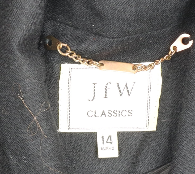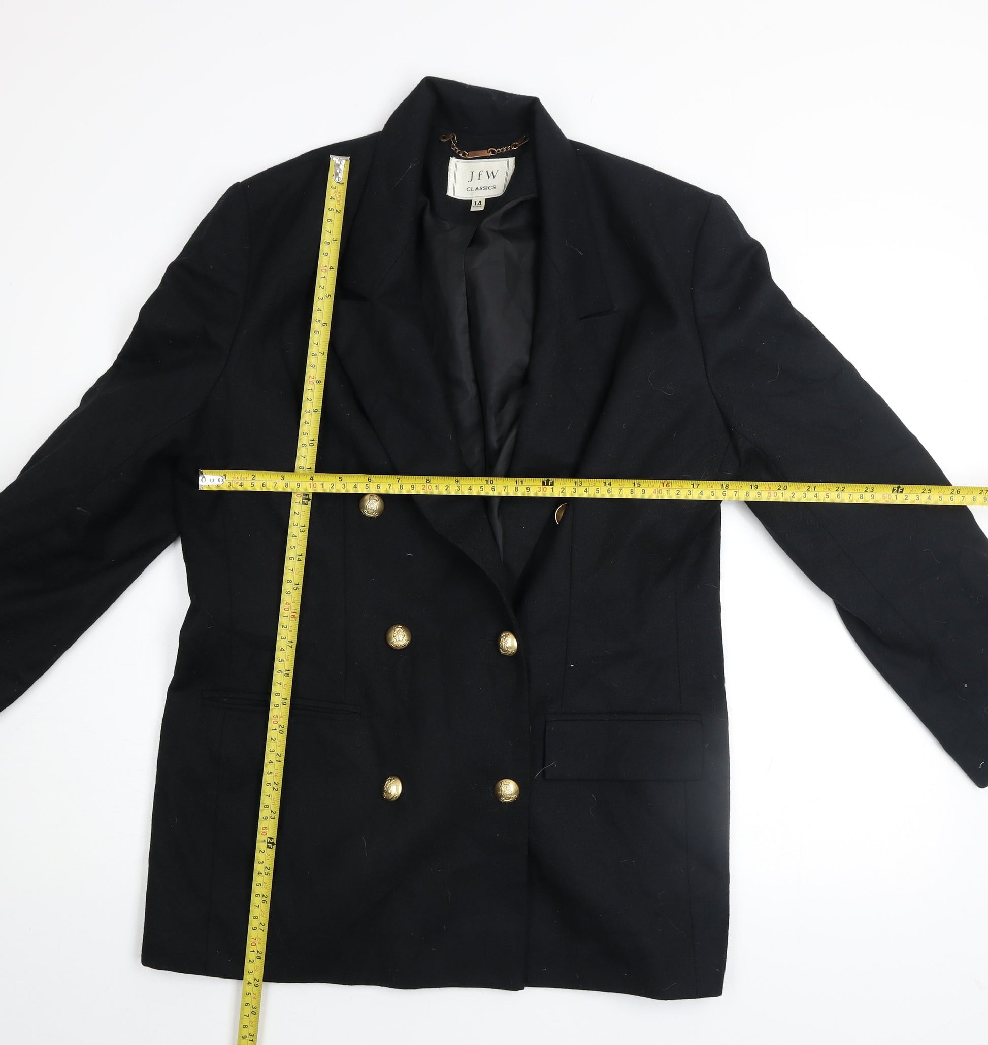 Add timeless sophistication to your wardrobe with this elegant JFW Classics women’s black wool blazer in UK size 14. Crafted from pure new wool, the luxurious textured fabric offers warmth and durability, making it a perfect choice for cooler seasons. It features a smart double-breasted front with striking gold-tone buttons that add a refined and polished aesthetic. The fully lined interior, made from smooth polyester, ensures a comfortable fit and a flattering drape. Designed with classic notched lapels, two front pockets and long sleeves with decorative button detailing on the cuffs, this blazer is ideal for professional and formal occasions. The mid-length cut provides a sleek silhouette that pairs perfectly with tailored trousers, skirts, or smart jeans, seamlessly transitioning from workwear to eveningwear. Combining timeless tailoring with quality craftsmanship, this JFW Classics blazer encapsulates effortless British style and sophistication. Whether you’re heading to the office, attending a meeting, or dressing up for a dinner, it’s a versatile piece that elevates any outfit. In very good pre-owned condition with only minor signs of wear and light lint, this jacket still retains its classic structure and charm. A staple addition to any modern woman’s wardrobe, this black wool blazer offers both comfort and confidence, promising a stylish statement for years to come.