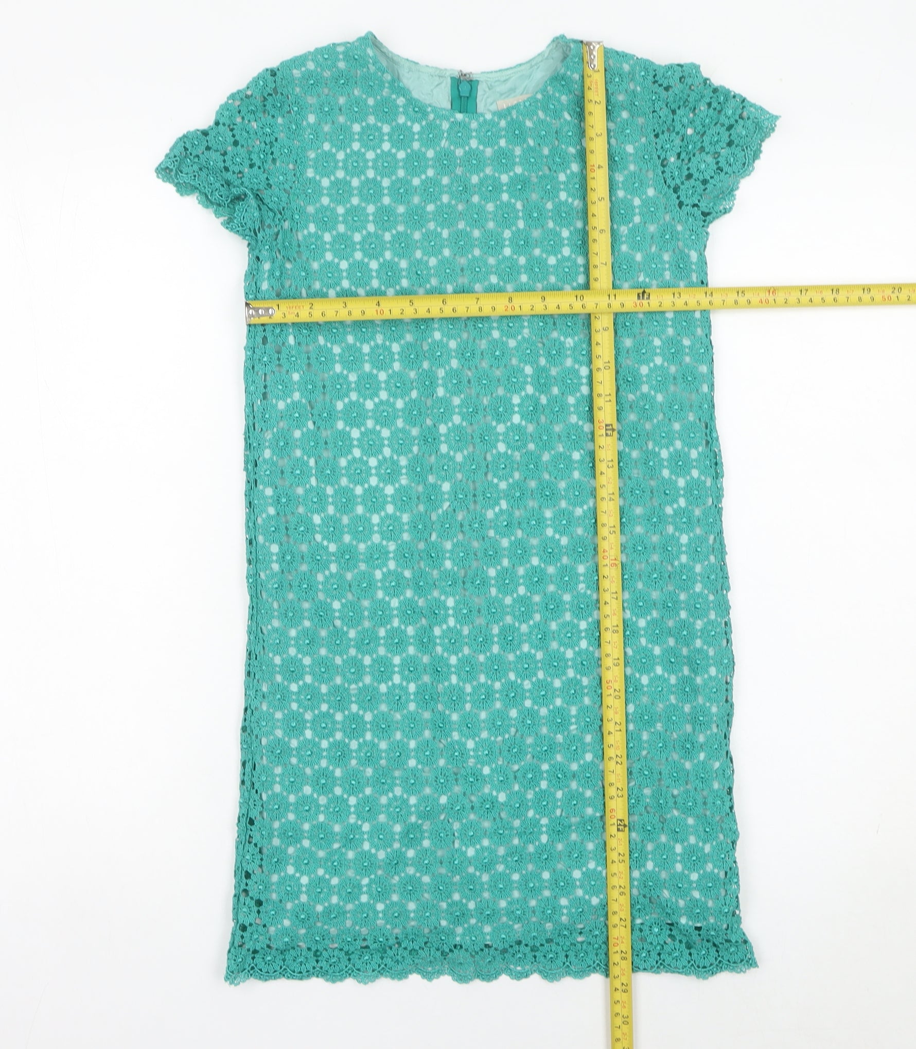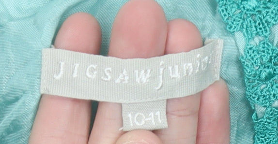 This beautiful Jigsaw Junior girls’ dress is a stylish option for special occasions, offering timeless elegance with a fresh, youthful touch. Crafted in a soft green shade, the dress features a delicate lace outer layer in a floral design that makes it perfect for parties, weddings, and formal occasions. The knee-length cut and shift silhouette give it a classic yet comfortable fit, while the scalloped lace edges add a refined finish. Designed with short cap sleeves and a round neckline, it combines simple elegance with intricate lace detailing. Made from 100% viscose fabric, the dress ensures a lightweight and breathable feel, keeping your child comfortable throughout the day. It comes fully lined for coverage and quality, enhancing the overall structure of the garment while allowing the lace outer to stand out beautifully. A practical zip fastening at the back provides ease of wear without compromising on the design. This dress reflects the quality and attention to detail that Jigsaw Junior is known for, presenting a piece that feels luxurious and well crafted.The dress is perfectly versatile for weddings, formal gatherings, birthdays, and other celebrations, yet remains youthful and age-appropriate. Its fresh spring and summer vibe makes it especially appealing for warm-weather events. In excellent condition, with no visible flaws and only minimal signs of previous wear, this pre-loved piece has been well maintained and is a lovely option for customers seeking high-quality children’s fashion at a more accessible price.Classic, charming, and easy to wear, this lace shift dress from Jigsaw Junior is an ideal choice for girls who love to dress up but also want to remain comfortable. The carefully considered details and reliable craftsmanship make it a standout addition to any special occasion wardrobe. With its timeless appeal, this elegant dress will be treasured for future events and family occasions.