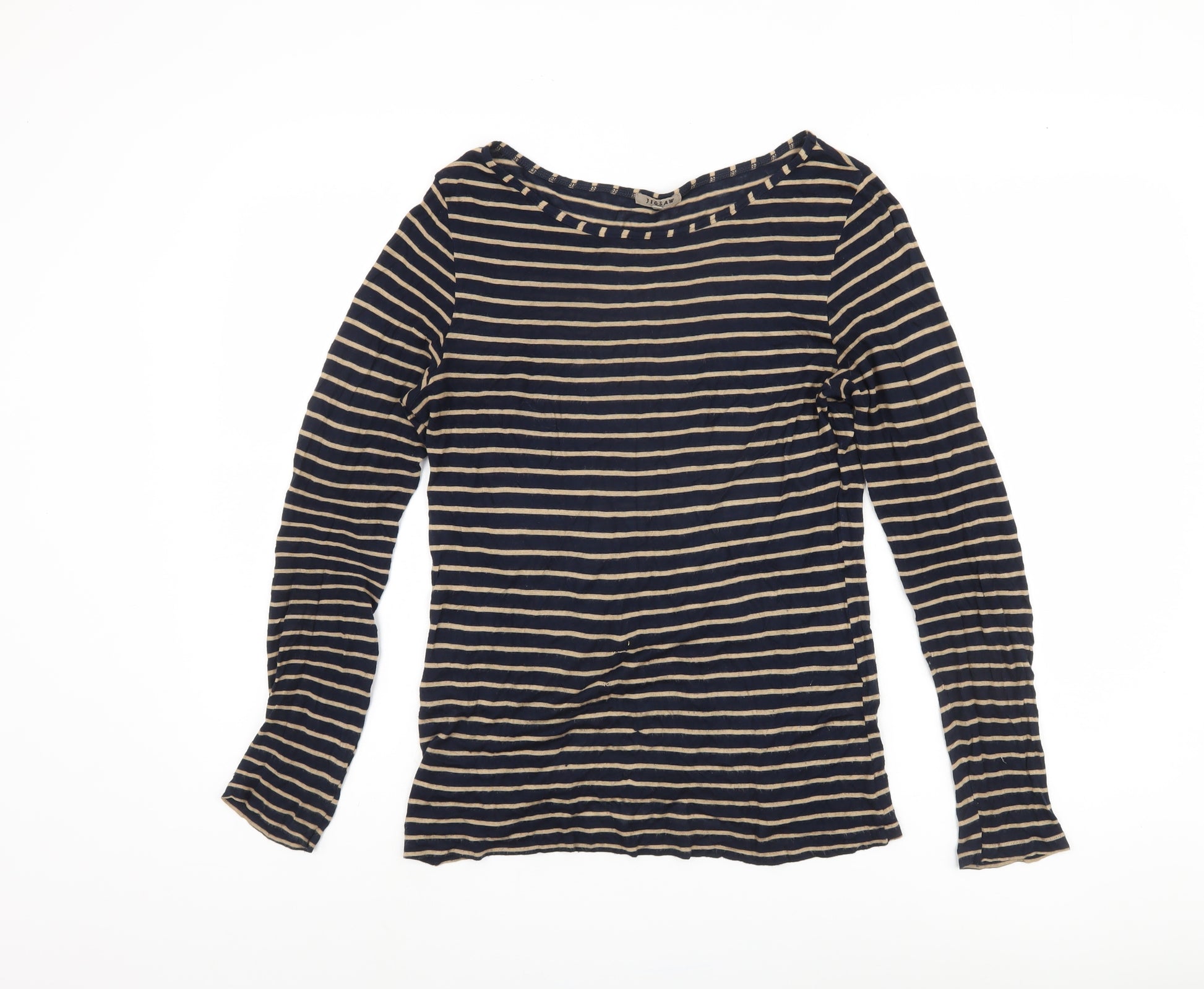 Discover effortless style with this chic striped top by Jigsaw, designed for the modern woman who values both comfort and fashion. This top features a flattering round neck and long sleeves, making it an ideal choice for layering or wearing on its own. The classic beige and black stripes add a touch of sophistication, perfect for both casual outings and smart-casual occasions. Crafted from 100% viscose, this top offers a soft and breathable feel, ensuring all-day comfort. The regular fit is versatile and suits a variety of body shapes, while the medium size makes it an accessible choice for many. Pair it with jeans for a relaxed look or dress it up with trousers for an office-ready ensemble. Enhance your wardrobe with this timeless piece that blends seamlessly with various styles and settings.