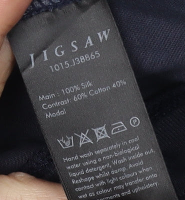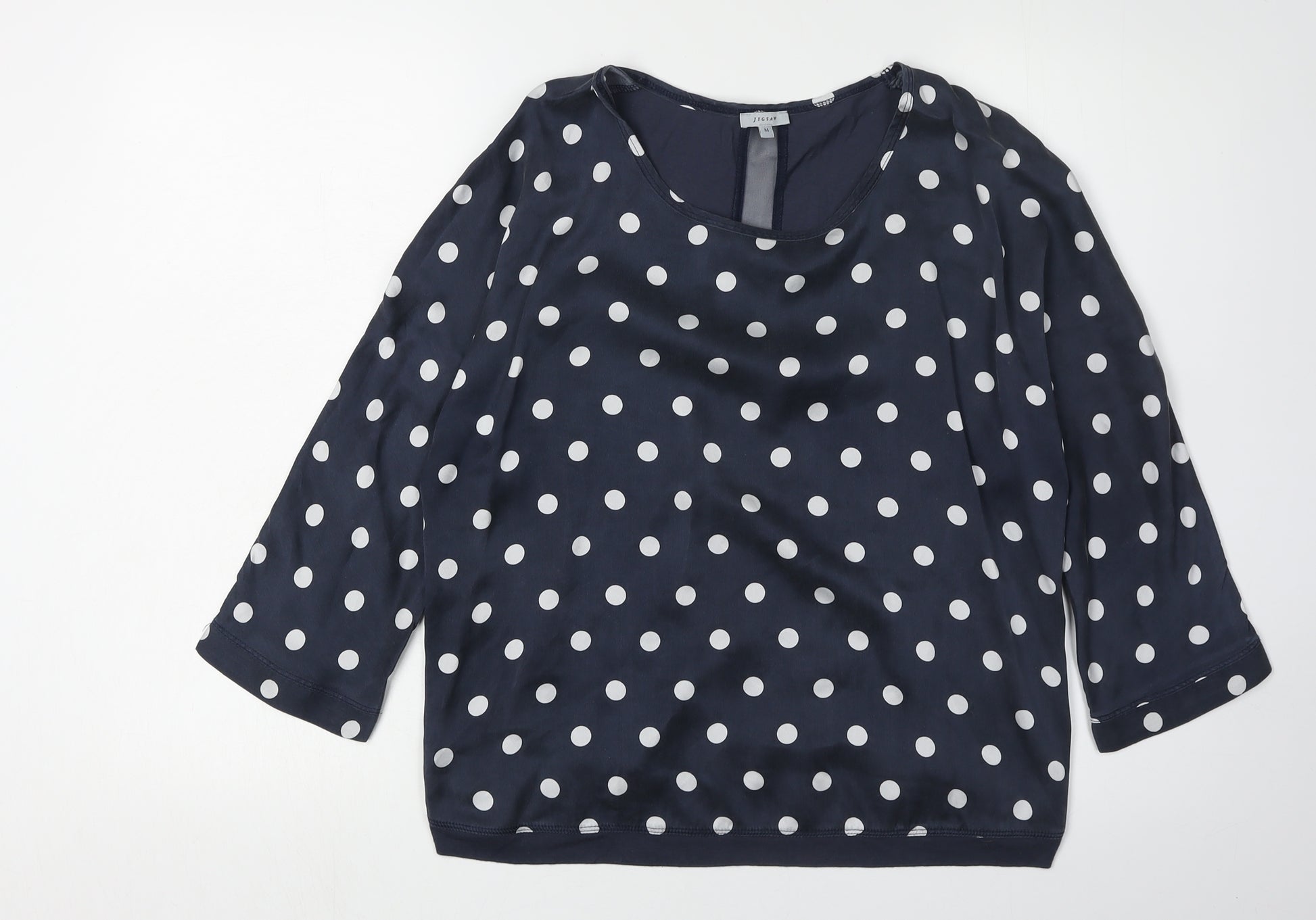 This elegant women's blouse from Jigsaw is a must-have addition to your wardrobe. Crafted from 100% silk, it offers a luxurious feel and is perfect for making a stylish statement. The black blouse features a timeless polka dot pattern, adding a touch of playfulness to your look. With its 3/4 sleeves, this blouse is ideal for both work and casual settings, providing a comfortable fit all day long. The crew neck design enhances its classic appeal, making it easy to pair with different accessories and layers. In excellent condition, this blouse has been lightly worn and shows minimal signs of wear. Its sophisticated style and high-quality material make it a versatile piece that can be dressed up or down. Whether you're heading to the office or meeting friends for coffee, this Jigsaw blouse is sure to turn heads. Stylish, comfortable, and in excellent condition, it's a fantastic choice for any fashion-conscious woman.