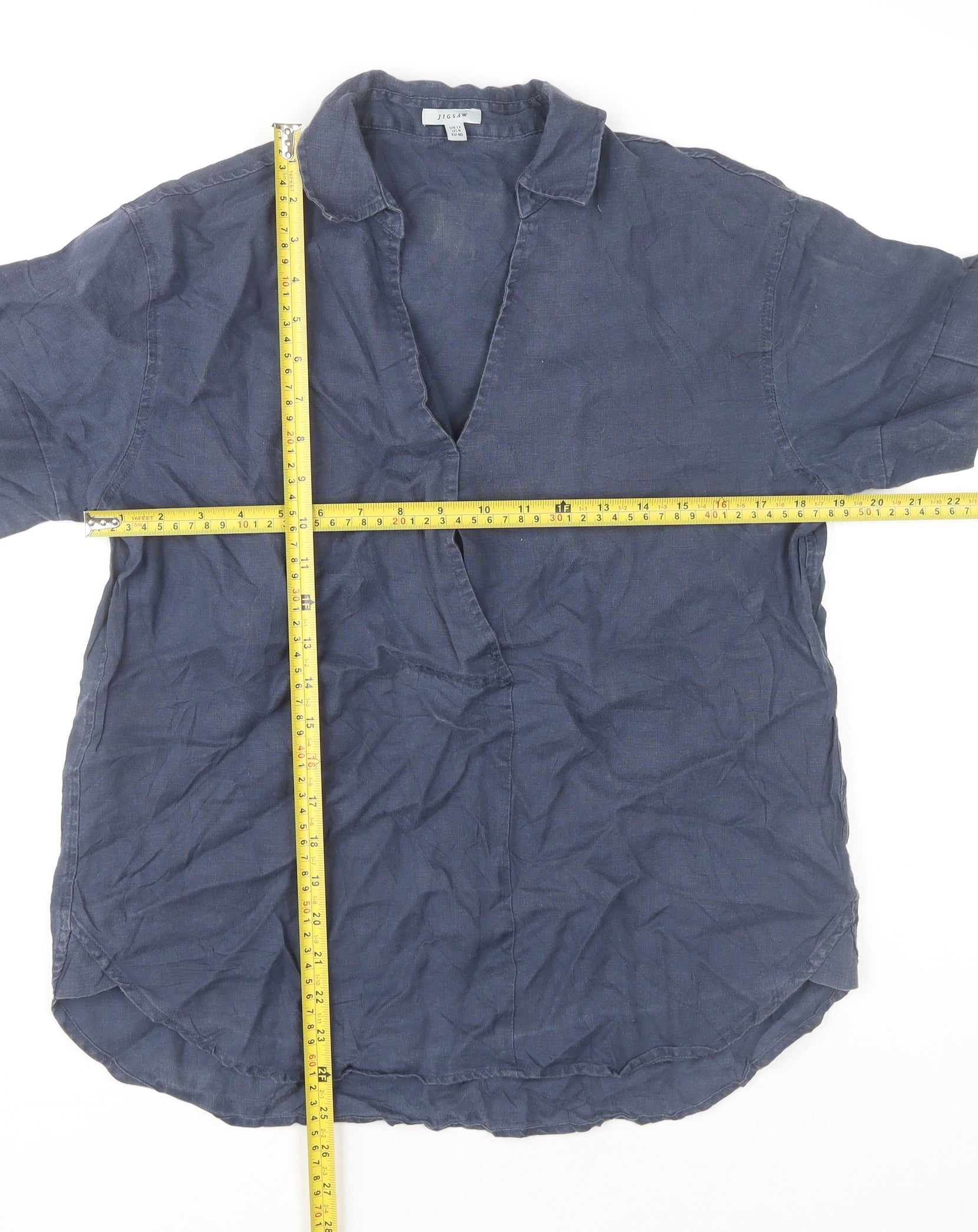 Refresh your summer wardrobe with this stylish Jigsaw women’s blouse in a versatile shade of blue. Crafted from 100% linen, this blouse offers exceptional breathability and lightweight comfort, making it ideal for warm weather. The woven fabric provides a soft yet durable feel, ensuring long-lasting wear while maintaining a natural drape. Designed with a classic collared neckline and short sleeves, it delivers an effortlessly chic look that transitions seamlessly from casual day outings to relaxed evening gatherings. The pullover style ensures ease of wear, and the regular fit flatters without feeling restrictive. Its solid colour makes it a timeless wardrobe staple, pairing beautifully with jeans, tailored trousers, or skirts. Perfect for summer, its breathable linen fabric helps you stay cool while exuding understated elegance. Whether worn for a laid-back lunch, holiday getaway, or casual work setting, this blouse combines classic design with everyday comfort. Jigsaw’s commitment to quality is evident in its fine construction and thoughtful details, offering a premium addition to your clothing collection. While this garment is in excellent pre-loved condition with minimal signs of wear, it has some natural creasing from storage that can be easily smoothed with ironing. The simplicity of its design opens endless styling possibilities, allowing you to layer it under blazers or cardigans or wear it loose over trousers for an easygoing vibe. Enhance your wardrobe with this essential linen blouse and enjoy a piece that stays fashionable season after season.