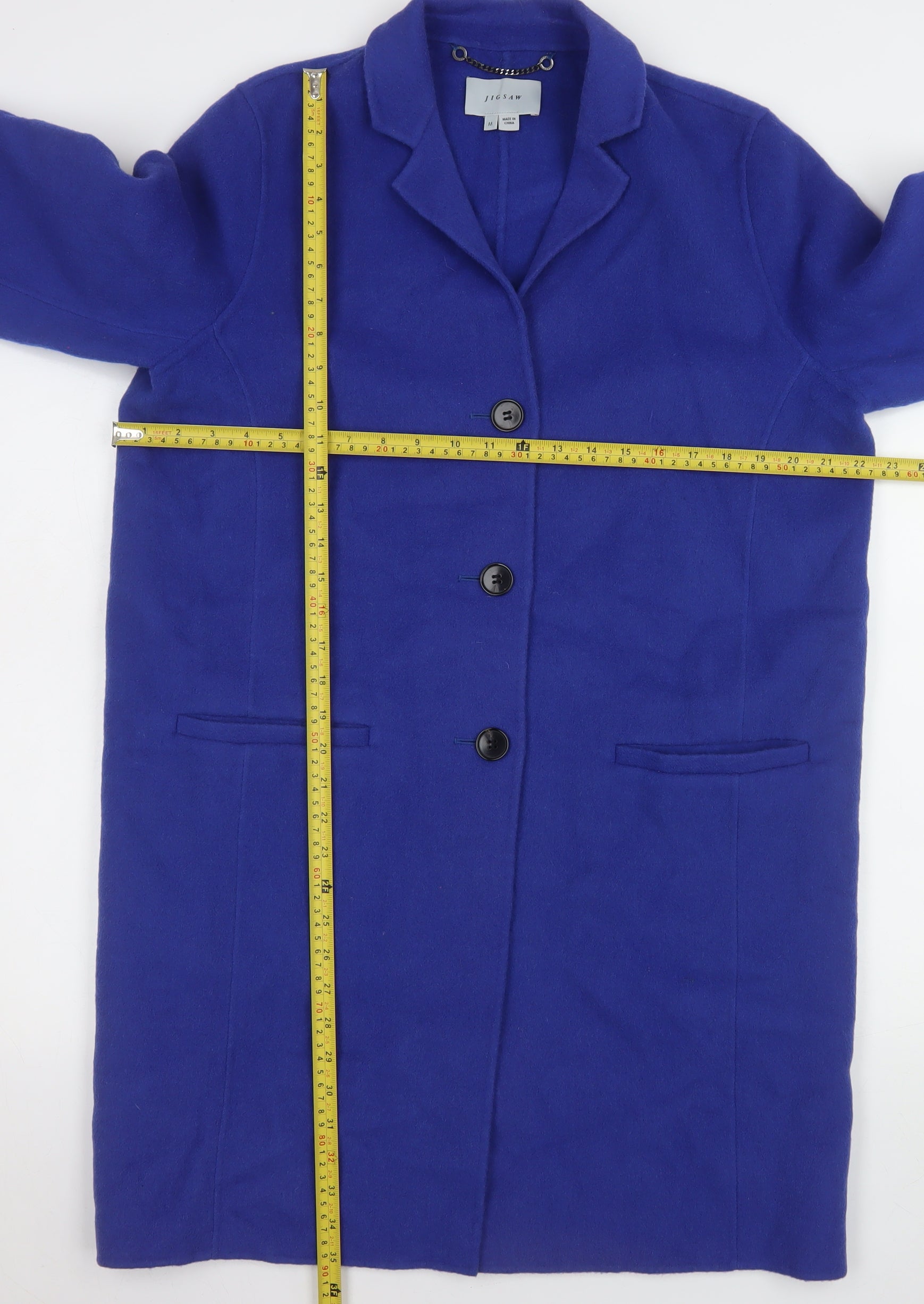 Elevate your outerwear collection with this stunning women's blue wool coat by Jigsaw. Crafted in a rich cobalt hue, this timeless overcoat exudes classic sophistication and versatile style, perfect for both business and casual wear. The coat features a flattering long length that provides excellent coverage and warmth during cooler months, making it an ideal choice for autumn and winter seasons. Designed with a traditional tailored silhouette, it has a collared neckline and single-breasted front secured by stylish black buttons, adding an elegant finishing touch. The exterior is made from soft, insulating wool fabric that offers excellent breathability and comfort while maintaining its shape beautifully. Two front welt pockets enhance practicality without compromising the coat’s clean design. With a smooth inner lining for easy layering over knitwear or office attire, this coat is designed for the woman who values quality, sophistication, and effortless style. Perfect for professional settings, everyday wear, or evening outings, this Jigsaw piece embodies the brand’s dedication to contemporary British tailoring. In excellent pre-owned condition with minimal signs of wear, this classic blue overcoat remains a wardrobe essential that will never go out of style. Pair it with tailored trousers for a business-ready ensemble or dress it down with denim for a refined weekend look. Its beautifully structured profile, premium craftsmanship, and timeless appeal ensure you’ll reach for it season after season. Discover the versatility and elegance that Jigsaw is known for with this must-have women’s wool coat, ideal for those who appreciate understated luxury and enduring fashion. A stylish investment piece for the modern woman.