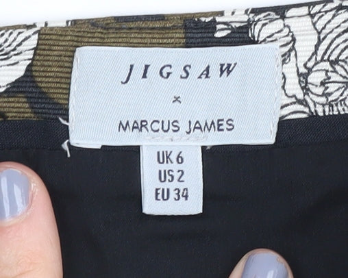 Elevate your wardrobe with this elegant Jigsaw Women's Pencil Skirt in size 6. Featuring a striking multicoloured floral pattern, this knee-length skirt is crafted from a blend of cotton and elastane, ensuring comfort and style. The mid-rise design enhances its flattering silhouette, making it an ideal choice for casual occasions during the warmer spring and summer months. With a secure zip closure, this skirt offers easy wearability. Expertly machine washable, maintaining its pristine appearance is effortless. Explore chic sophistication with this versatile piece that complements any outfit. Don't miss out on adding this exquisite skirt from Jigsaw to your collection.