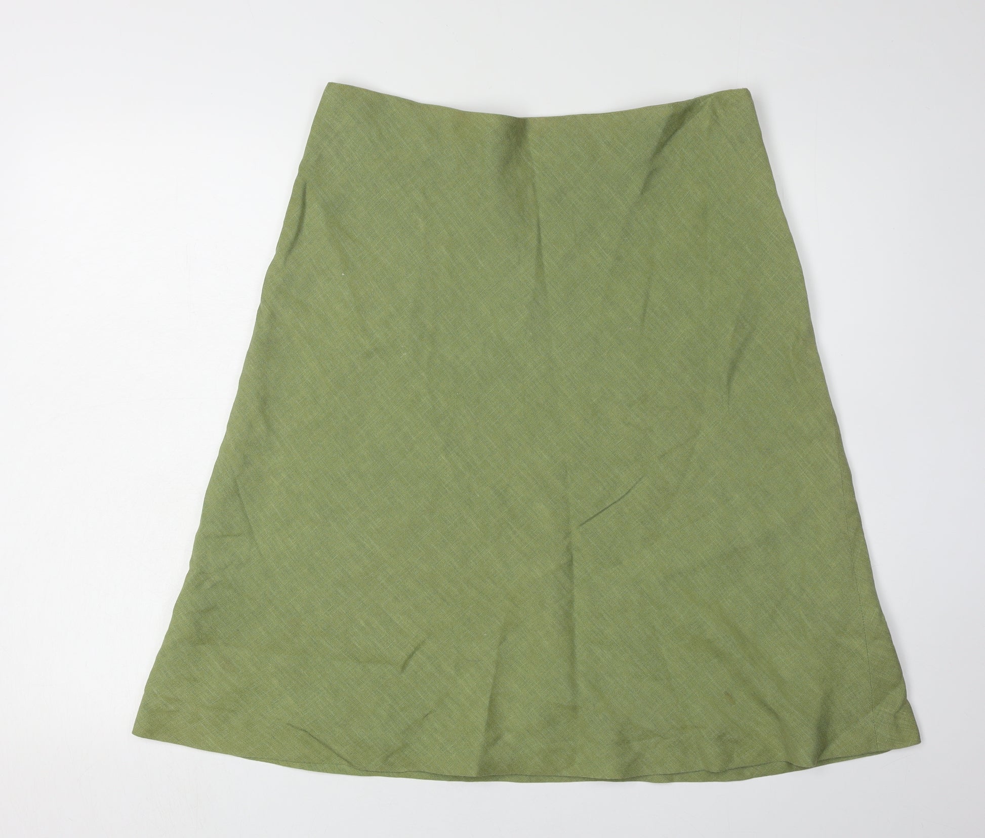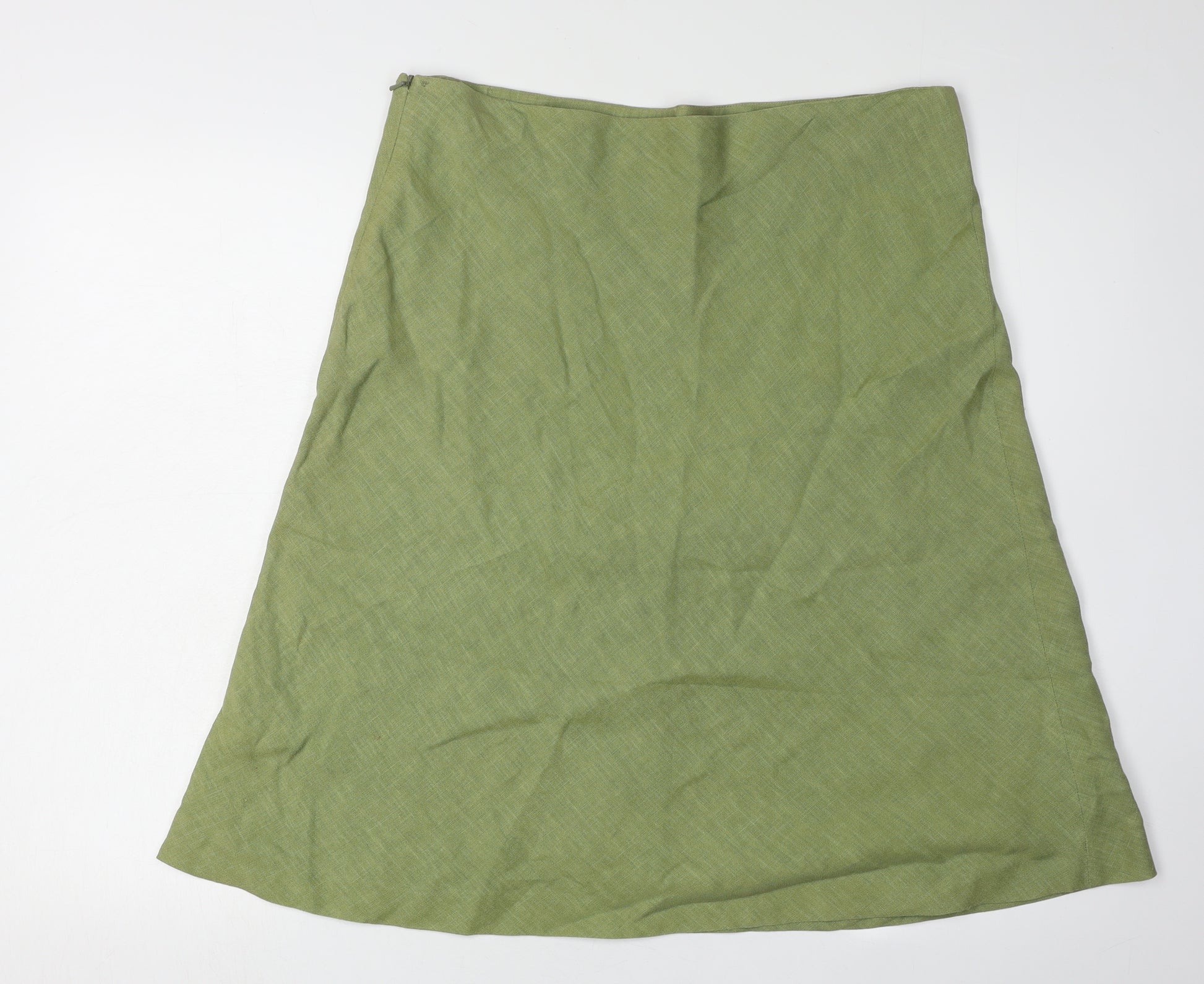 Elevate your wardrobe with this charming green A-line skirt from Jigsaw, perfect for the modern woman's casual summer outings. This versatile piece is tailored from a comfortable blend of 72% linen and 28% viscose, ensuring lightweight and breathable wear. Specifically designed in a size 14, it offers a flattering fit for regular sizes, making it an essential addition to any woman's collection. The skirt is designed with simplicity in mind, featuring a discreet zip closure and a clean, no-pattern appearance. Although pre-owned, it maintains a very good condition, with only a slight stain, adding character to its overall vintage-inspired look. Ideal for casual occasions, this skirt effortlessly pairs with any top, from plain tees to elegant blouses. Bring a touch of understated elegance to your summer wardrobe and enjoy the breeze in style with this fabulous green Jigsaw skirt.