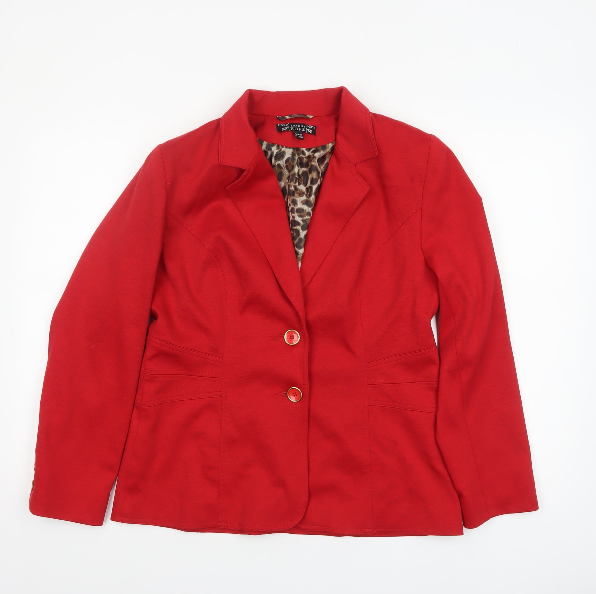 This elegant red blazer from Joanna Hope brings together classic tailoring and modern sophistication, ideal for a professional wardrobe or special occasions. Crafted with attention to detail, the jacket features a sharp, notched lapel design complemented by a flattering, tailored silhouette that enhances the figure while ensuring comfort and ease of movement. The vibrant red hue adds a confident and bold statement to any outfit, perfect for business meetings, formal gatherings, or simply elevating a smart casual look. Made from a premium blend of 80% polyester, 16% viscose, and 4% elastane, the woven fabric offers durability with a subtle stretch for a flexible fit. The interior is fully lined with 100% polyester featuring a stylish leopard-print finish, adding a touch of personality and luxury to the design. Functional elements such as two front buttons, long sleeves with triple button detailing, and carefully structured seams give it a refined, polished look. The regular fit and standard jacket length make it a versatile piece that pairs effortlessly with trousers, skirts, or dresses. Machine washable for practical care, this blazer combines fashion with function for the modern woman. Perfect for office wear, formal events, or as a chic layering option, this Joanna Hope blazer in size 12 exudes confidence, elegance, and timeless style. Its well-made construction and excellent condition ensure it will remain a wardrobe staple for many seasons to come. Whether paired with crisp white tailoring or dark jeans for a smart-casual ensemble, this piece makes a strong fashion statement while maintaining comfort and class.