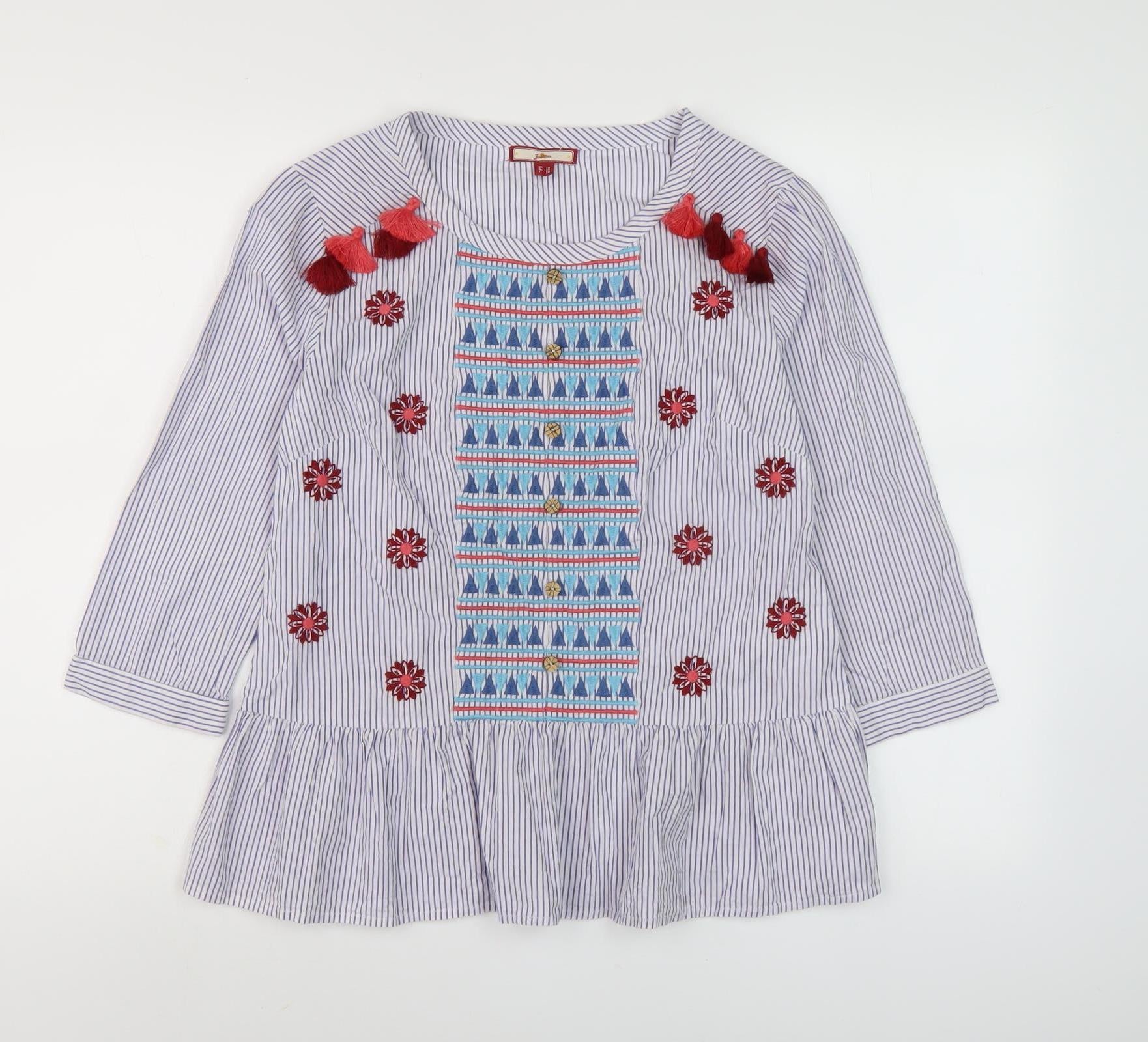 Elevate your style with this enchanting Joe Browns Women's Blouse, a perfect piece for adding a touch of bohemian flair to your wardrobe. Crafted entirely from premium cotton, this lightweight blouse is not only comfortable but also machine washable, making it an ideal choice for everyday wear. The multicoloured design features a delightful blend of embroidered patterns and playful tassels that add a unique and fun element to your look.The blouse comes in a flattering UK size 10 and boasts a regular fit, ensuring a comfortable silhouette for any casual occasion. The 3/4 sleeves and round neckline contribute to its relaxed vibe, making it an excellent choice for the warmer seasons of spring and summer. A woven fabric type offers a textured feel while maintaining breathability.With a pattern of fine stripes, this blouse seamlessly combines classic charm with contemporary details. The embroidery accents paired with tassels further enhance its bohemian theme, making it a standout piece for those who love to express their individuality through their clothing choices. Whether you're heading to a casual outing or a laid-back weekend event, this blouse promises to keep you both stylish and comfortable. Discover the joy of effortless elegance with this remarkable Joe Browns creation.