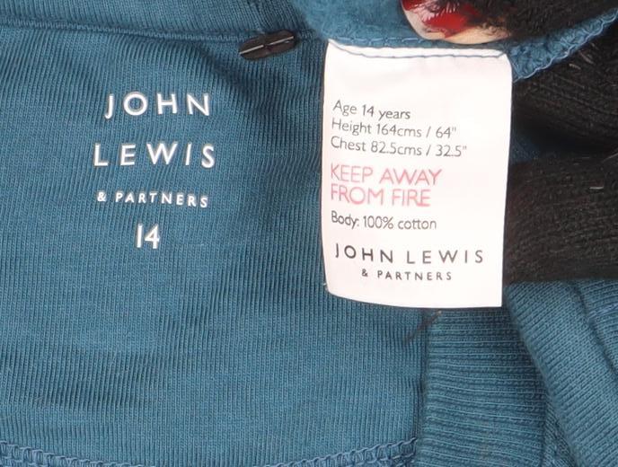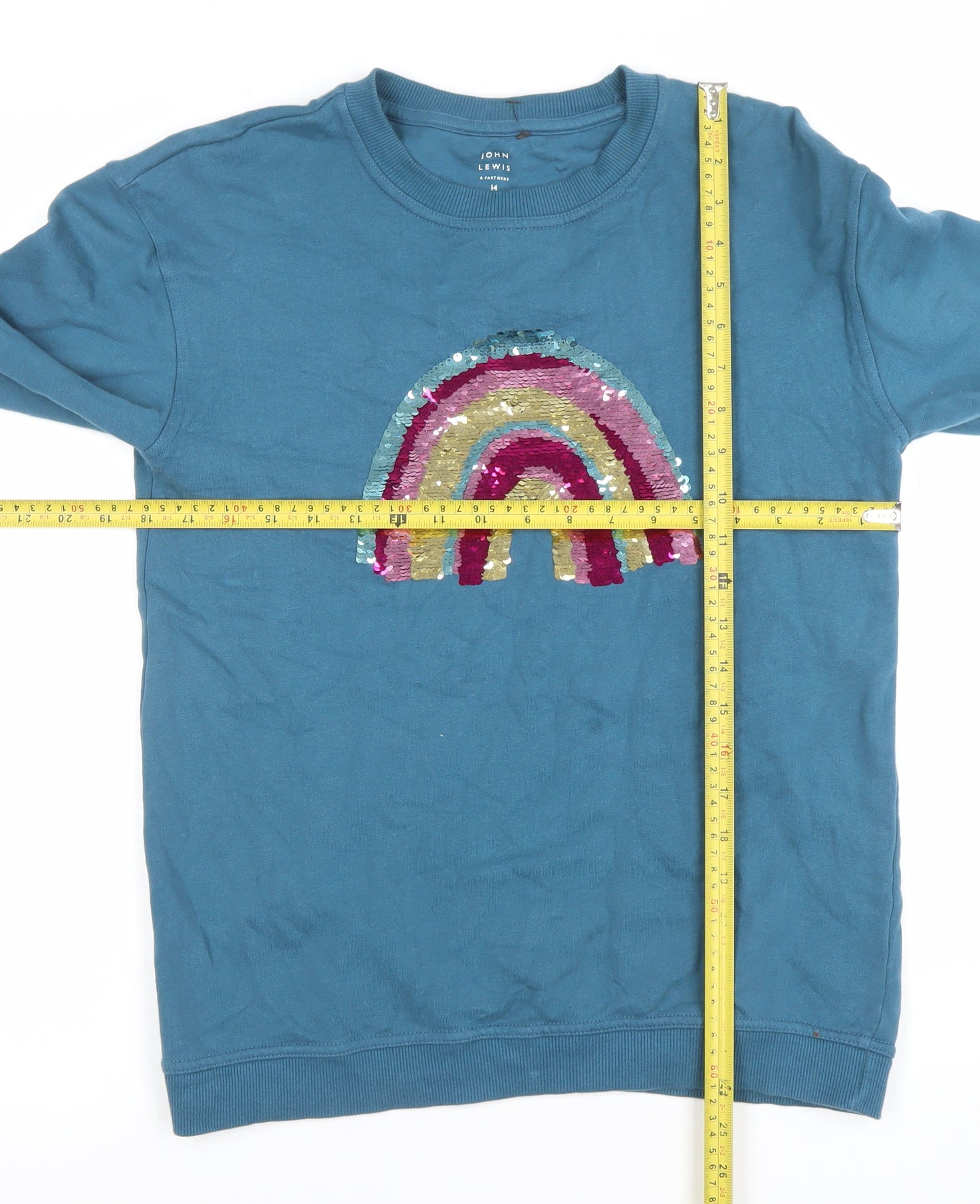 Brighten up her casual wardrobe with this charming blue sweatshirt from John Lewis, designed especially for girls aged 14 years. Crafted from 100% cotton, it delivers a soft, breathable, and comfortable fit ideal for everyday wear or layering in cooler seasons. The sweatshirt features a classic crew neck cut with ribbed cuffs and hem for a snug, secure feel that maintains comfort throughout the day. Its standout detail is a beautiful rainbow design across the chest, made from shimmering sequins in shades of pink, gold, and turquoise, adding a fun and cheerful touch that’s perfect for expressing youthful personality and style.Built in a regular fit silhouette, this pullover sweatshirt offers ease of movement and a relaxed finish. The material is lightweight yet durable, making it suitable for wearing both at school and during leisure time. Easy to care for, it is fully machine washable, ensuring practicality for everyday use. The versatile blue tone pairs effortlessly with jeans, skirts, or leggings, creating endless outfit options.This sweatshirt is in excellent pre-loved condition, showing light wear with no visible marks or flaws, and retains its original shape and bright colours. Whether layered under a jacket during autumn and winter or worn on its own in spring, this John Lewis sweatshirt blends comfort, style, and a hint of sparkle, making it a delightful addition to any girl’s wardrobe. Perfect for casual outings, school days, or cosy weekends at home, it brings together quality craftsmanship and timeless fun in one adorable piece. A great choice for parents seeking durability and design that grows with their child.