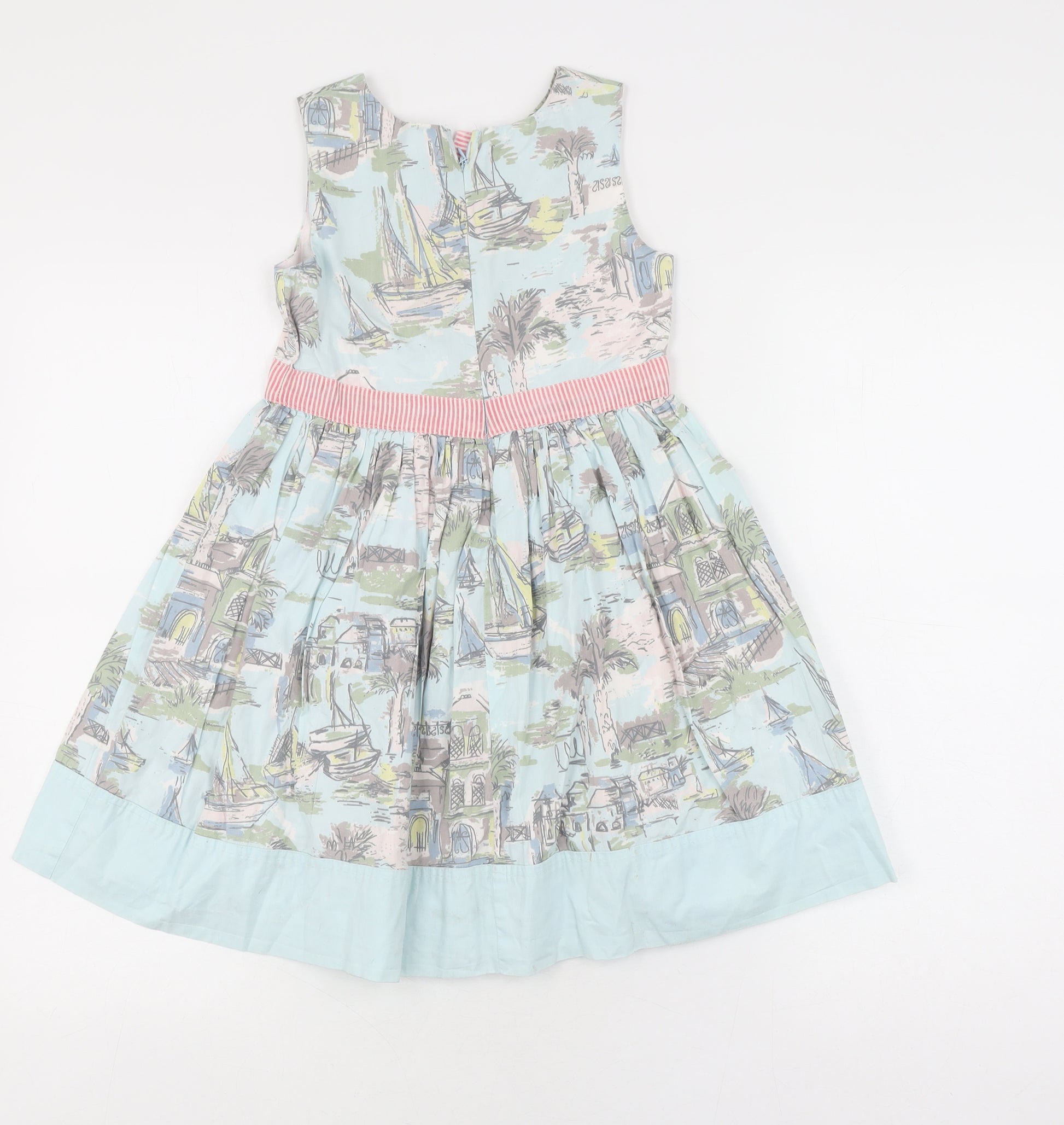 This charming John Lewis girls' dress is perfect for sunny days and brings a playful vibe with its scenic pattern featuring landmarks and palm trees. Made from 100% cotton, it ensures a soft and comfortable fit. The knee-length A-line silhouette is both flattering and versatile, suitable for casual outings and fun parties. The dress showcases a lovely mix of colours, adding a vibrant bohemian touch to your little one's wardrobe. The sleeveless design and round neck make it suitable for spring and summer adventures, while the bow detail on the waist adds an extra touch of elegance. With a zip closure for easy dressing and a lined interior for added comfort, this dress is both practical and stylish. Machine washable for hassle-free care, it promises to be a go-to option for any occasion. Although it lacks original sales tags, it remains in excellent condition with minor signs of wear. Perfectly priced, this John Lewis piece invites your child to explore in style.