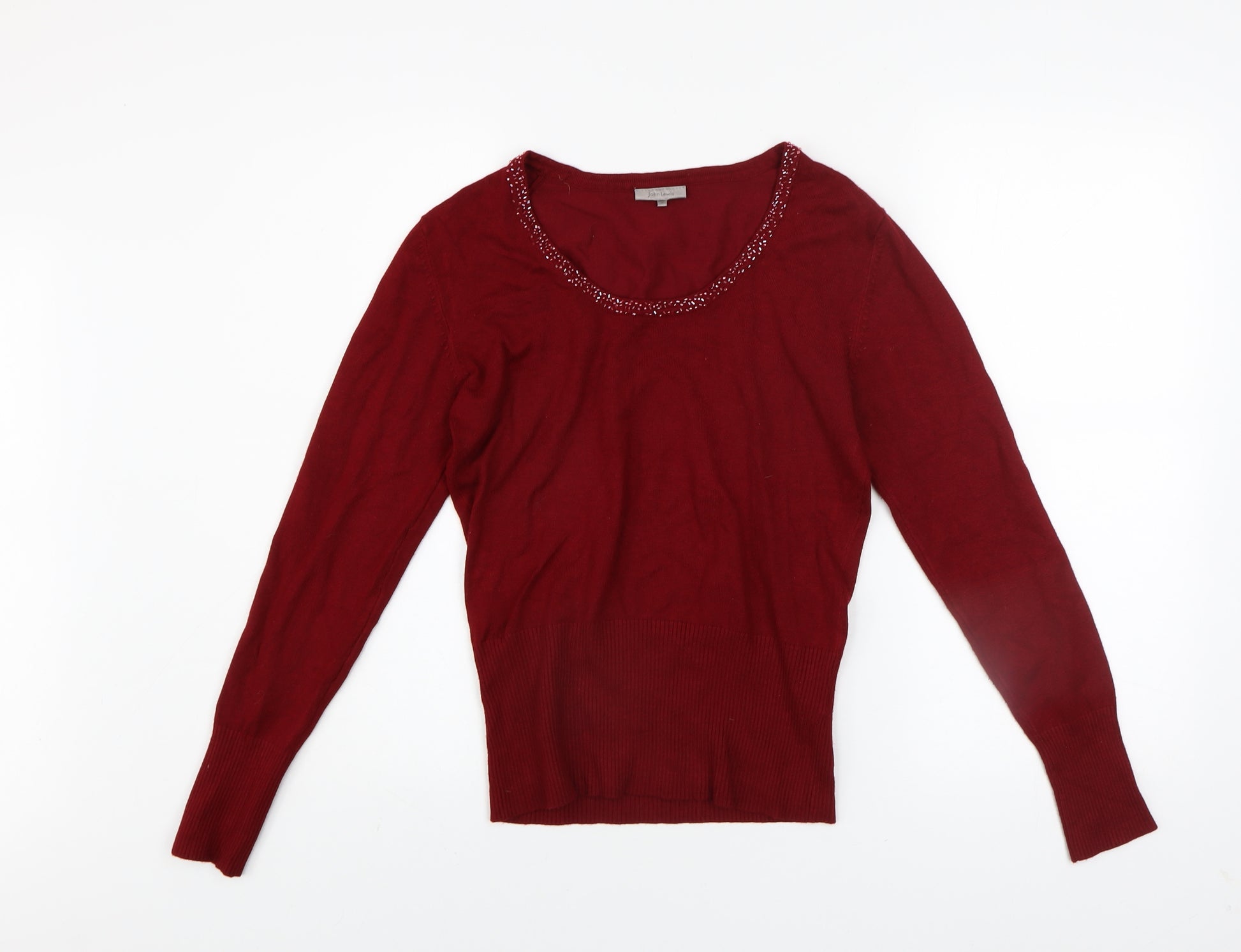 This beautiful women's pullover sweater from John Lewis brings timeless sophistication to your wardrobe. Crafted in a rich red colour, it perfectly balances elegance and comfort, making it an ideal piece for both casual and dressier occasions. The soft material blend of viscose and nylon ensures a smooth, lightweight feel with a flattering drape that complements various body shapes. Designed with a classic round neckline accented by delicate beaded embellishments, this jumper adds a touch of sparkle for a chic, feminine look. The long sleeves and ribbed hemline provide a structured fit while keeping you warm and stylish during cooler weather. Its fine knit construction offers breathable comfort, ideal for transitioning between seasons, whether worn over a smart shirt for work or layered casually with jeans. The medium size fits true to UK women’s sizing, allowing ease of movement without sacrificing sophistication. Perfect for autumn and winter, this John Lewis sweater pairs seamlessly with both skirts and trousers, making it a wardrobe staple that enhances any outfit. With subtle details and quality craftsmanship that John Lewis is known for, this red beaded pullover radiates understated glamour at an affordable price. Excellent condition with minimal signs of wear, ready to elevate your everyday style.