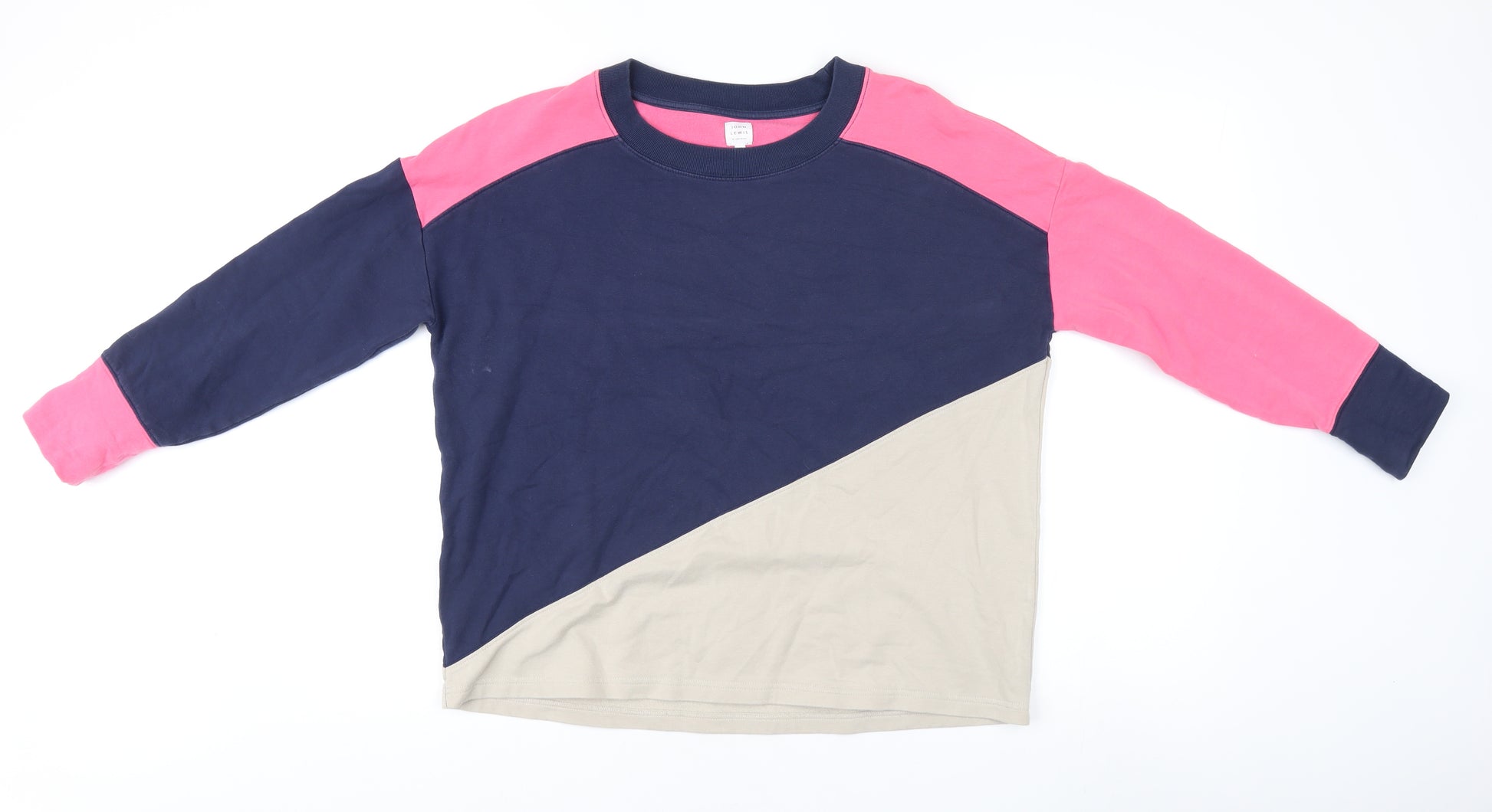 Enhance your wardrobe with this stylish pullover jumper from John Lewis, designed specifically for women. The medium-sized jumper features an eye-catching multicoloured design, combining hues of blue, pink, and beige. Crafted from a comfortable cotton blend, the jumper ensures a cozy and snug fit, perfect for casual wear in any season. The crew neck and long raglan sleeves add a classic touch, making it an ideal choice for laid-back outings or weekend activities. This regular fit jumper is machine washable, allowing for easy care and maintenance. While it lacks original sales tags, it remains in excellent condition, showing minimal signs of wear. Upgrade your casual ensemble with this versatile and vibrant addition from a trusted brand. Don't miss out on a timeless piece that merges comfort and style effortlessly.