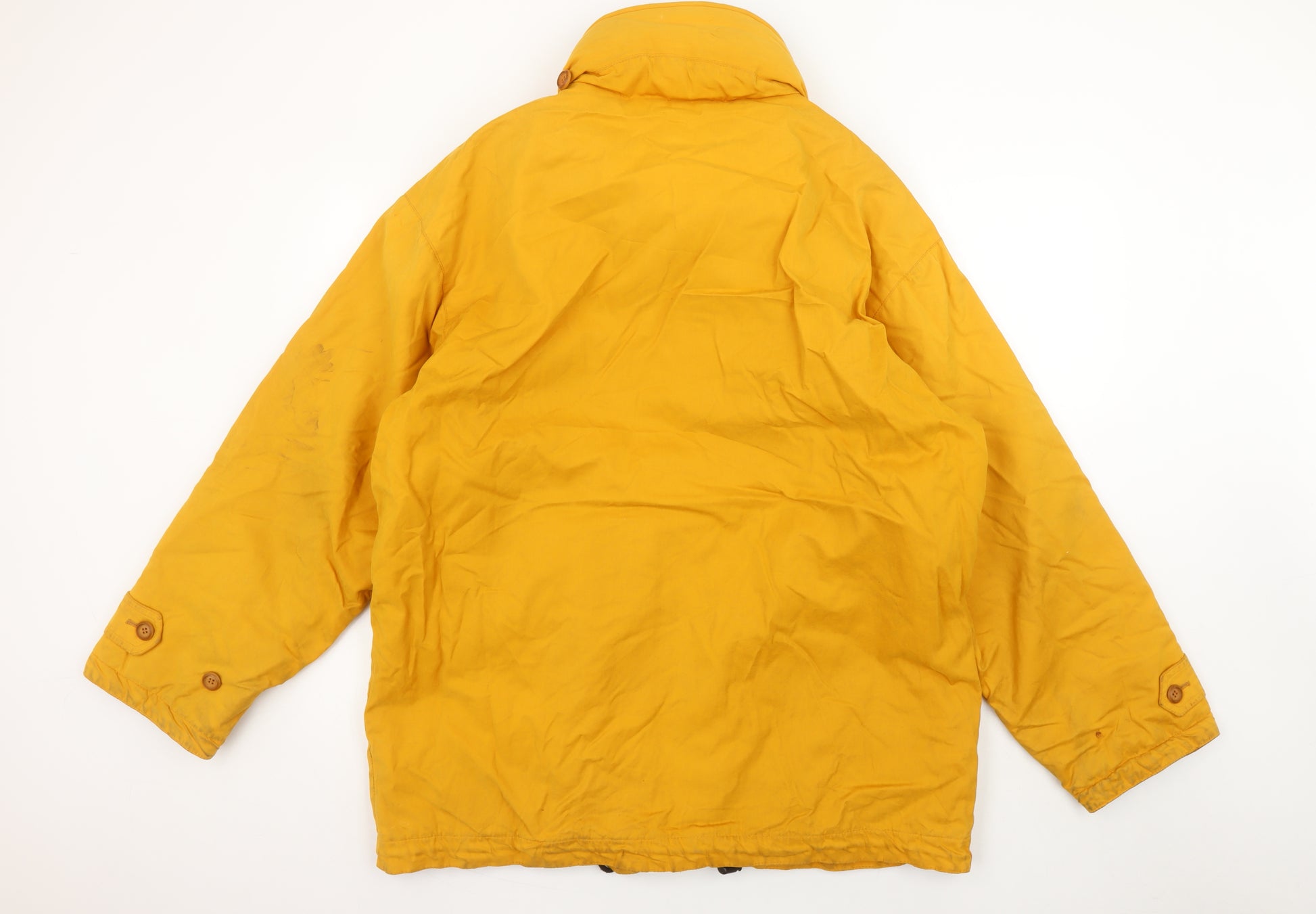 Step out in timeless British style with this John Partridge men's yellow cotton parka jacket, handmade in England and crafted from durable cotton with a 23% resin finish for enhanced weather resistance. This mid-length jacket showcases the brand’s renowned attention to detail, featuring a traditional button front closure, spacious flap pockets for practicality, and a warm tartan lining that perfectly balances form and function. Designed for reliability and comfort, it’s ideal for autumn and winter wear, offering protection from the elements while keeping the look sophisticated. The stand-up collar enhances the classic country aesthetic, creating a perfect fusion of practicality and timeless elegance. The rugged cotton canvas outer shell provides long-lasting wear, while the bright mustard-yellow hue adds a modern twist to a traditional silhouette. Perfect for casual outings, countryside strolls, or day-to-day workwear, this jacket embodies quality English craftsmanship. The piece shows light signs of use, including some faint wear marks on the sleeve and lower areas, adding to its authentic vintage appeal without detracting from its overall charm. Handmade with care, it captures the essence of heritage outerwear – hardworking, classic, and built to last. Whether layered over chunky knits or city casuals, this John Partridge coat is an ideal companion for men who appreciate functional fashion with traditional flair. Its waterproof characteristics, heavy-duty cotton fabric, and craftsmanship ensure it delivers in both durability and distinctive British style. A practical investment piece that resonates with outdoor lifestyle enthusiasts and lovers of timeless English tailoring alike.