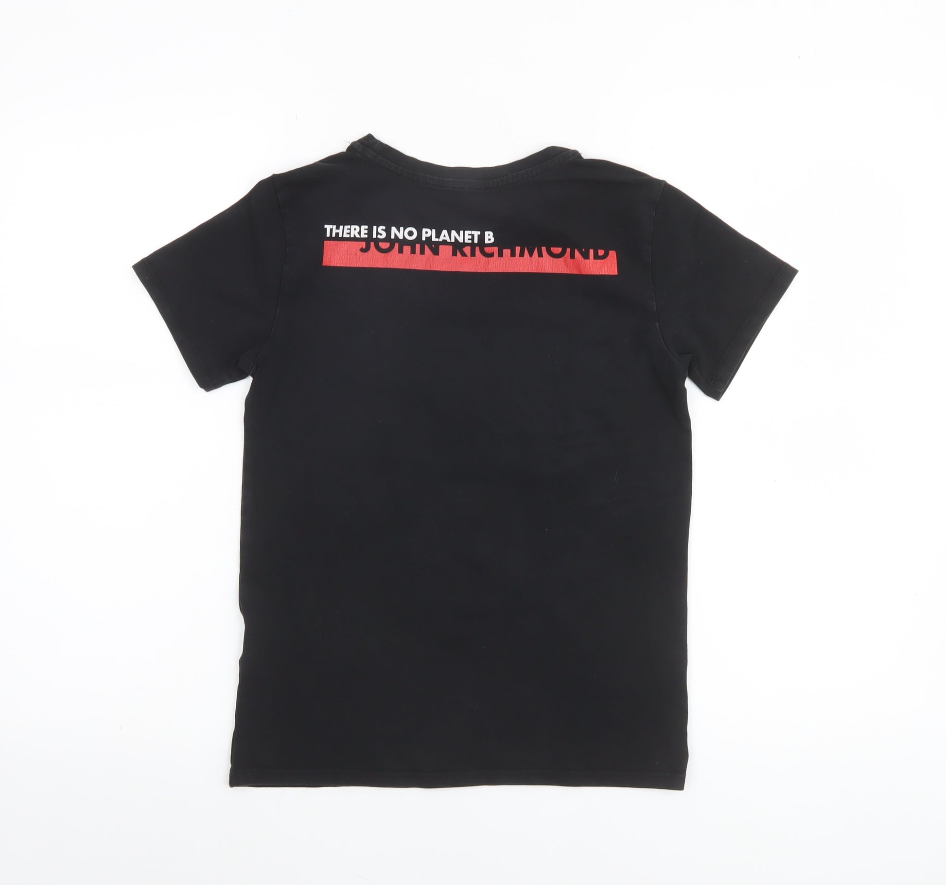 This John Richmond Boys Black Graphic Print Cotton T-Shirt is a stylish and meaningful piece perfect for everyday wear. Crafted from a soft and breathable cotton and elastane blend, it offers comfort and quality with a touch of stretch for easy movement. The black base is enhanced with a bold red skull and crossbones graphic and the slogan 'There Is No Planet B', reflecting an eco-conscious message that encourages individuality with purpose. The print is both eye-catching and impactful, making it an ideal choice for fashion-forward kids who love to stand out while staying comfortable.The T-shirt features a classic crew neckline and short sleeves, making it a versatile staple for casual wear throughout the seasons. The back of the shirt carries a minimalist branded print with 'John Richmond' lettering in red, adding a designer touch to the simple silhouette. Its jersey fabric composition ensures the tee is lightweight and breathable – perfect for pairing with jeans, shorts, or joggers.Designed for boys around age 10, the fit is a comfortable regular cut that allows freedom of movement. The item shows minimal signs of wear, maintaining its excellent condition without any stains or imperfections, though it no longer has its original tags. Ideal for school days, weekend outings, or relaxed family occasions, this designer T-shirt combines premium quality with a modern statement.Priced competitively for such a reputable designer brand, this gently used John Richmond tee represents great value and sustainability in children’s fashion. Whether gifted or worn as part of an expressive wardrobe, it’s a standout choice combining comfort, style, and conscience in one essential piece.