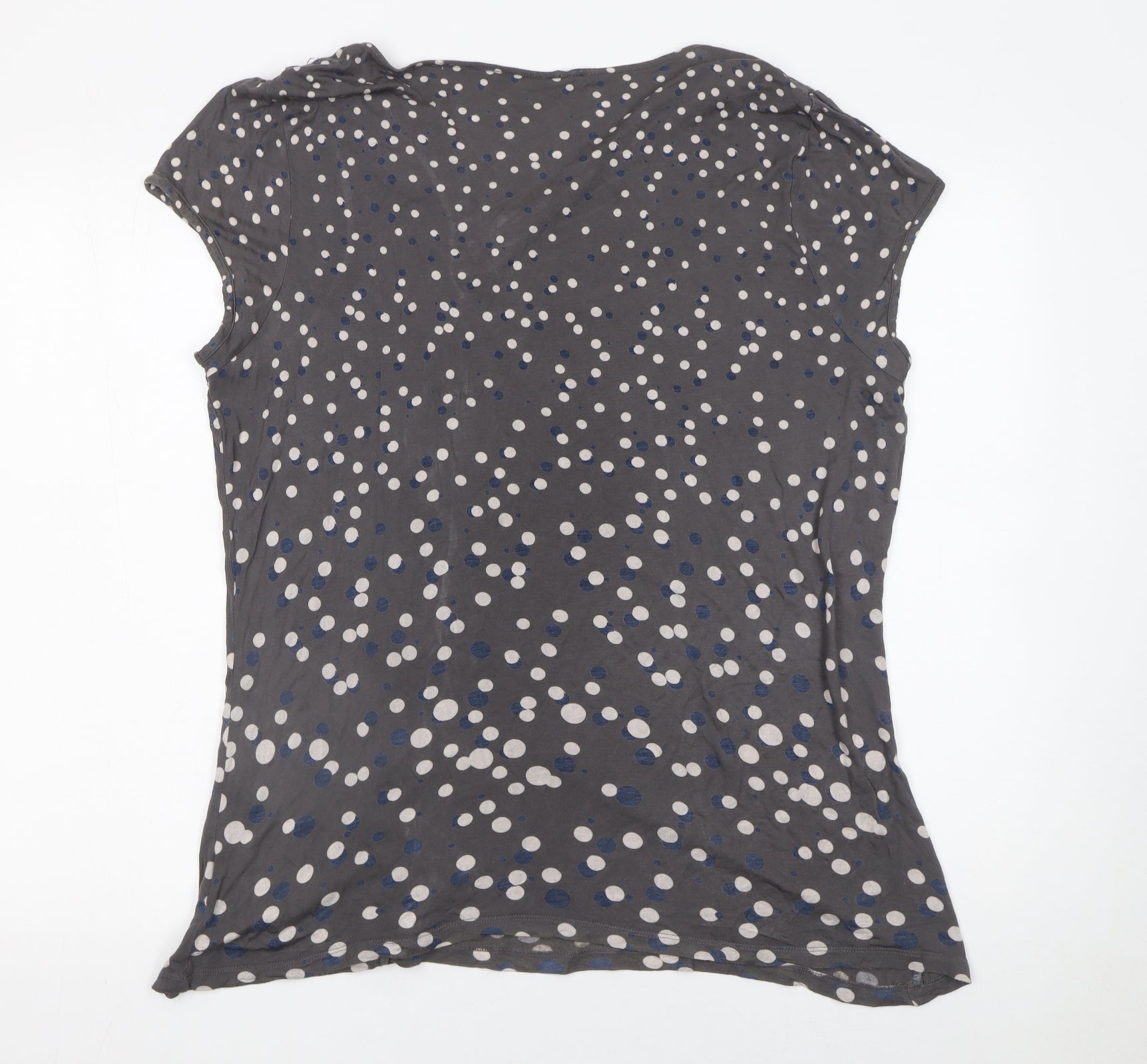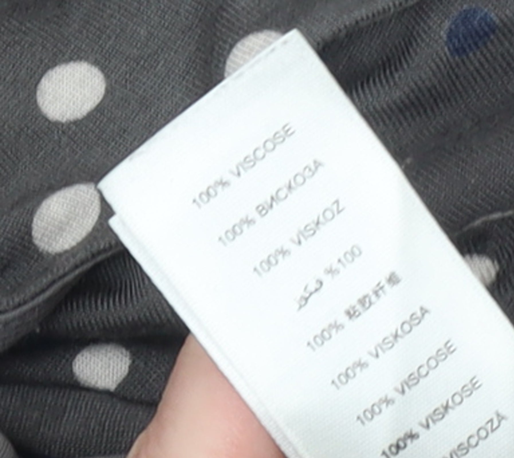 Elevate your casual wardrobe with this charming women's grey polka dot blouse by John Rocha. Crafted from 100% viscose, the top offers a soft, lightweight, and breathable feel, ensuring comfort throughout the day. Designed in a flattering tunic style, this short sleeve blouse features a stylish ruffled trim cascading down the front, adding a feminine and unique touch. The gentle V-neckline enhances its flattering silhouette, making it a versatile piece suitable for both work and leisure wear. The delicate polka dot print in shades of white and navy complements the versatile grey background, providing a timeless yet playful look that pairs effortlessly with denim, smart trousers, or skirts. Its breathable woven viscose fabric drapes beautifully, offering a relaxed regular fit perfect for warmer months. Ideal for spring and summer occasions, this blouse is a staple for any modern woman's wardrobe. Easy to care for and machine washable, it combines practical wearability with elegant design elements. Whether you’re dressing up for a lunch outing, a casual day at the office, or a weekend stroll, this John Rocha piece offers both sophistication and ease. In excellent pre-loved condition with no noticeable flaws or marks, it’s ready to wear and enjoy. A must-have versatile top that embodies effortless style and comfort for any occasion.