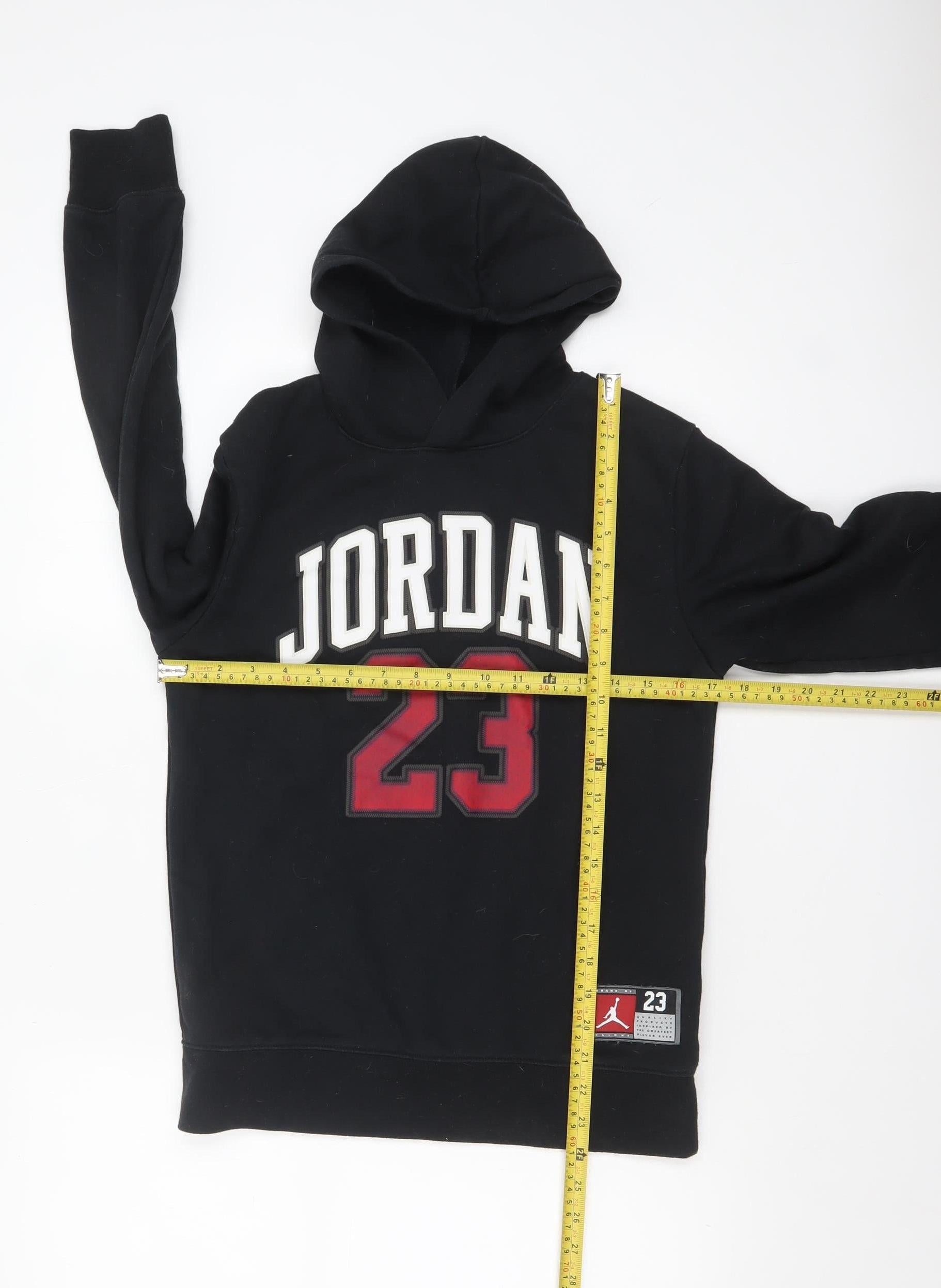 This Jordan boys black pullover hoodie is a classic addition to any young athlete’s wardrobe, offering comfort, warmth, and iconic style. Designed in timeless black with bold red and white 'Jordan 23' lettering on the front, this hoodie pays homage to a heritage of sporting excellence. Crafted from a soft blend of 60% cotton and 40% polyester, the fabric provides a comfortable yet durable wear ideal for casual outfits or active days. The hood delivers added warmth and style, while the premium stitching ensures long-lasting quality. Perfect for layering, the hoodie’s relaxed fit and breathable fleece interior make it suitable for every season — from cool autumn mornings to breezy spring afternoons. The pullover style provides easy wear without the fuss of fastenings, and the rib-knit cuffs and hem retain shape wash after wash. The fleece fabric ensures a soft interior feel, keeping your child comfortable throughout their daily adventures. The bold front logo and branded patch along the hem add that unmistakable Jordan sport identity. This piece is an essential for school, sports, or casual outings, combining sporty edge and reliable comfort.Condition is excellent with no visible marks or damage — only light signs of prior wear and minor lint due to the nature of the fabric, which can be easily removed. A staple for any Jordan or basketball fan, this hoodie combines fashion and function effortlessly. Comparable pre-owned Jordan boys’ hoodies in similar condition typically sell for around £20–£25 online, making this a great value choice for a quality branded hoodie.Add this stylish and versatile piece to your little one’s casualwear collection and let them step out in confidence with authentic Jordan flair.