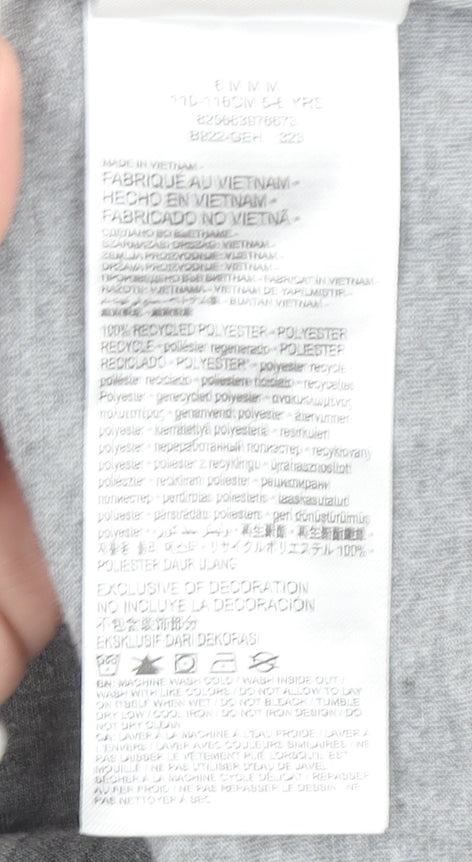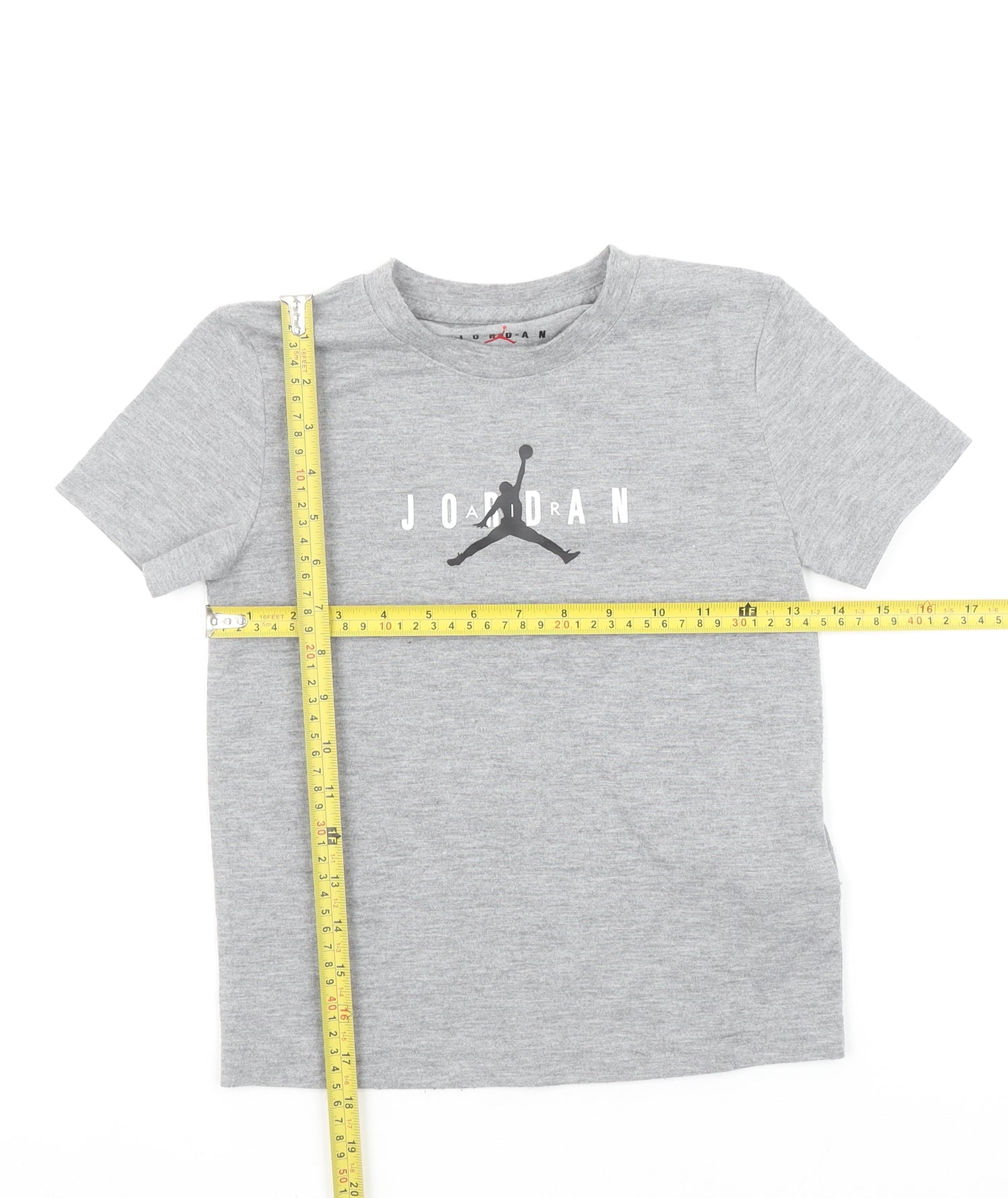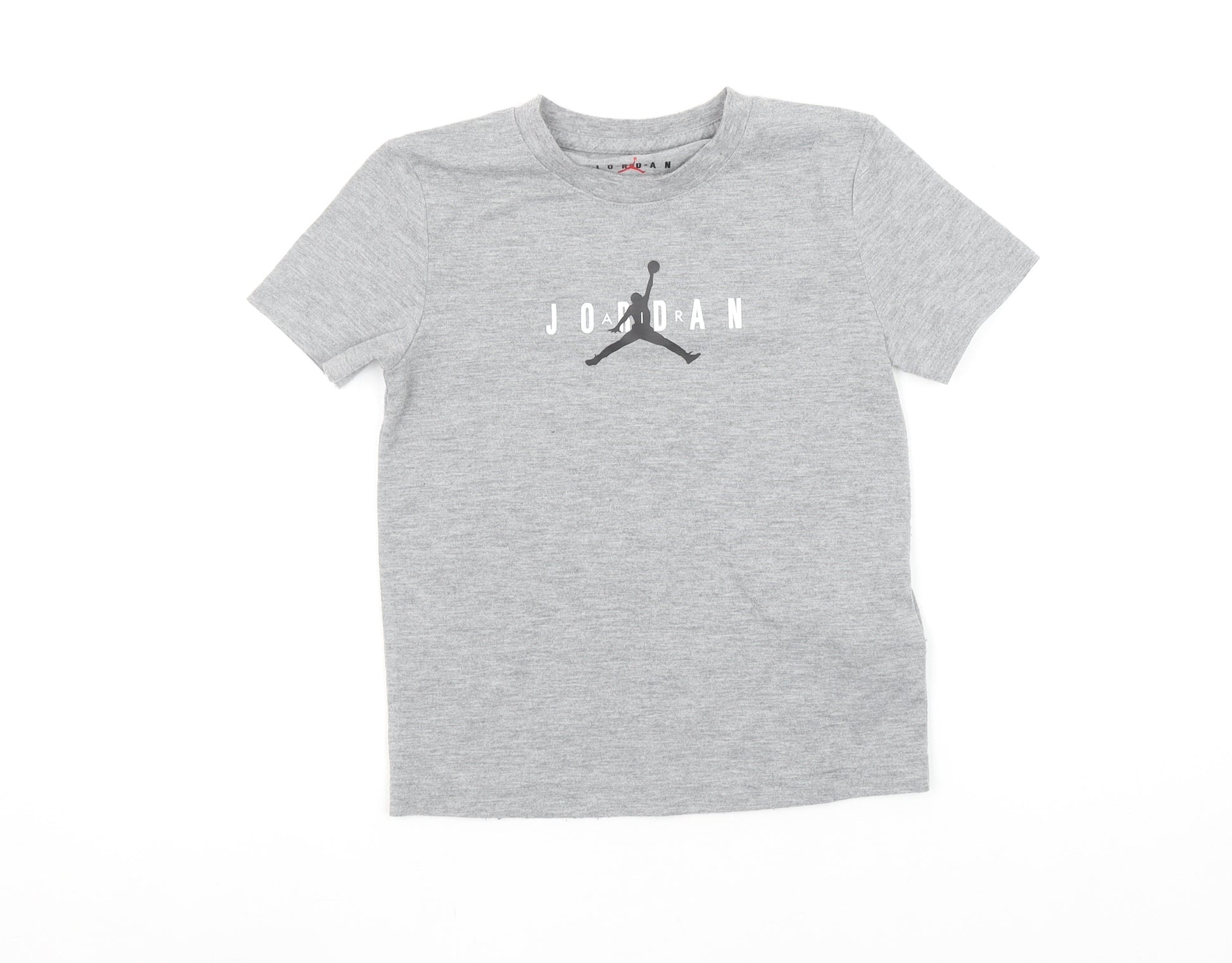 Elevate your child's everyday casual wear with this stylish grey Jordan Boys Sports Logo T-Shirt. Crafted for comfort and durability, this modern essential features the iconic Jumpman logo in black against a soft heather grey backdrop, creating a clean and sporty aesthetic that boys love. The short sleeve, crew neck design ensures a comfortable, relaxed fit ideal for active days, school, or play. Constructed from 100% recycled polyester, this lightweight and breathable tee provides a soft, smooth feel against the skin while promoting environmental sustainability through its eco-conscious material choice. The durable jersey fabric maintains its shape wash after wash, and the high-quality logo print adds a touch of athletic style associated with the Jordan brand. Perfect for wearing on the court, at the gym, or as everyday casual wear, this T-shirt encapsulates the blend of performance and fashion that Jordan apparel is known for. Designed to keep up with young athletes, it easily pairs with joggers, shorts, or jeans, making it a versatile wardrobe staple for any season—spring, summer, or autumn. Machine washable for easy maintenance, this tee is ready for everyday adventures while retaining its crisp look. In excellent used condition with no stains or holes, the shirt shows minimal signs of wear and remains ideal for extended use. Whether your child is a basketball enthusiast or simply enjoys a sporty look, this grey Jordan T-shirt delivers performance, comfort, and iconic style in one. A perfect choice for active kids who appreciate both comfort and brand appeal.