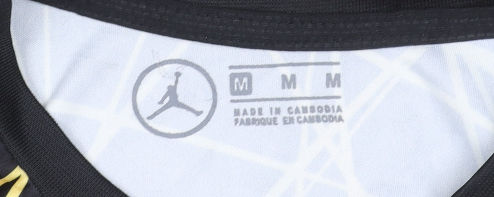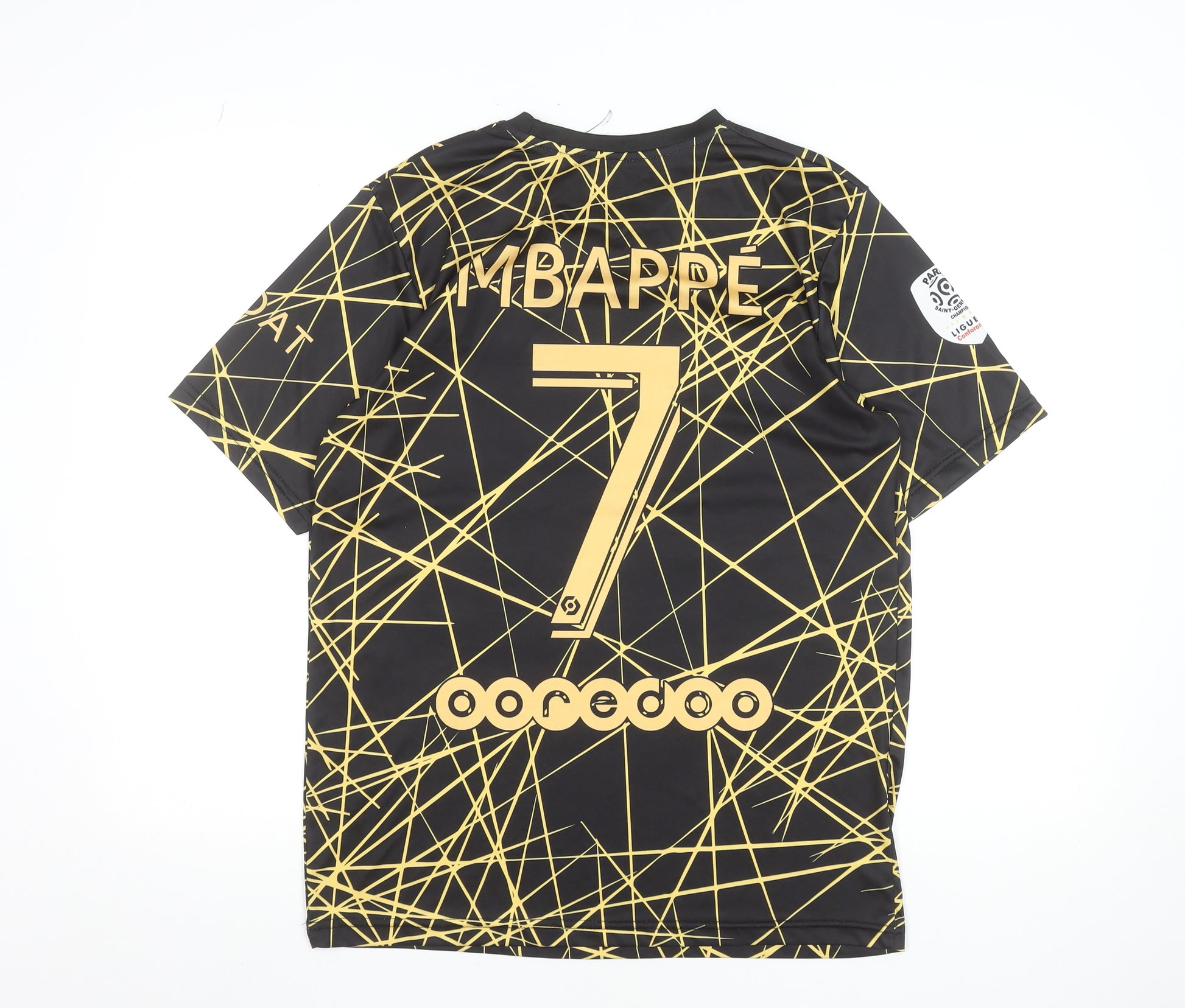 Elevate your football style with this sleek Jordan PSG men’s jersey in striking black with gold geometric detailing. Designed for both performance and style, this athletic-fit T-shirt is crafted from 100% polyester, ensuring a lightweight, breathable, and moisture-wicking experience. Ideal for high-energy training sessions or casual wear, it keeps you comfortable and cool whether you’re on the pitch or off-duty. Featuring the iconic PSG crest and bold sponsor graphics, this top combines modern athletic design with timeless football appeal. The short-sleeve design and crew neckline provide unmatched comfort and unrestricted movement. The premium polyester fabric wicks sweat efficiently, while the durable construction makes it perfect for sports like football, running, or gym training. Its sleek geometric pattern provides a standout look that pairs effortlessly with your favourite activewear or casual pieces. This jersey is in excellent used condition with no visible flaws, reflecting careful wear and quality craftsmanship. It makes a great addition to any football fan’s wardrobe, embodying Parisian style and Jordan’s distinctive sporting touch. Versatile enough for summer or spring wear, its classic pullover design offers easy functionality without compromising on aesthetics. Whether you’re showing off your support for PSG or simply adding a stylish and functional piece to your activewear collection, this top delivers quality, comfort, and performance. Machine washable for easy care, it’s built for those who value both endurance and design. Step into the season with confidence and style in this Jordan PSG football tee — an essential for every football enthusiast seeking comfort and flair.