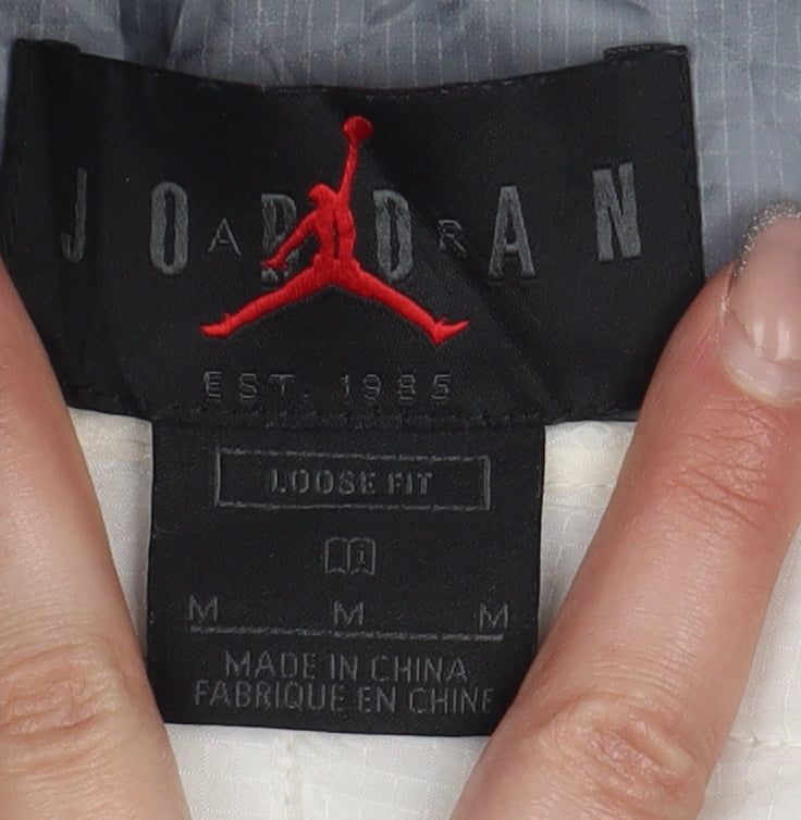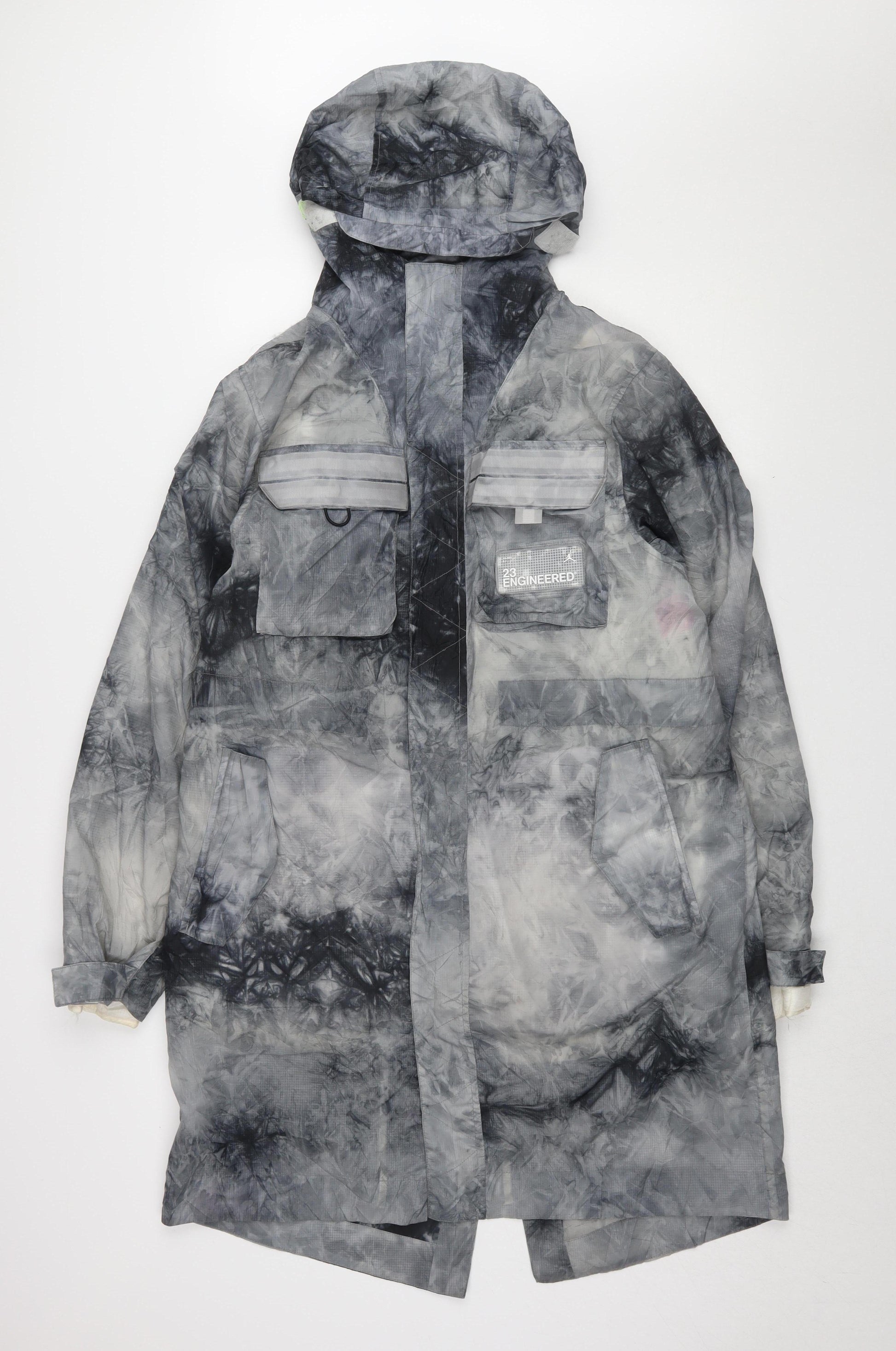 Stay stylish and ready for any weather with this Jordan rain coat. Designed for both men and women, this multicoloured jacket is a versatile addition to any wardrobe. The mid-length design and relaxed fit ensure comfort, while the lightweight, waterproof features make it perfect for the unpredictable weather of spring, summer, or autumn. Made from durable nylon with a hood, this jacket offers practicality without compromising on style. The logo accents add a sporty touch, making it ideal for casual outings or travel. Despite a light stain on the front pocket, this jacket is in very good condition and offers a fashionable solution for staying dry and comfortable.