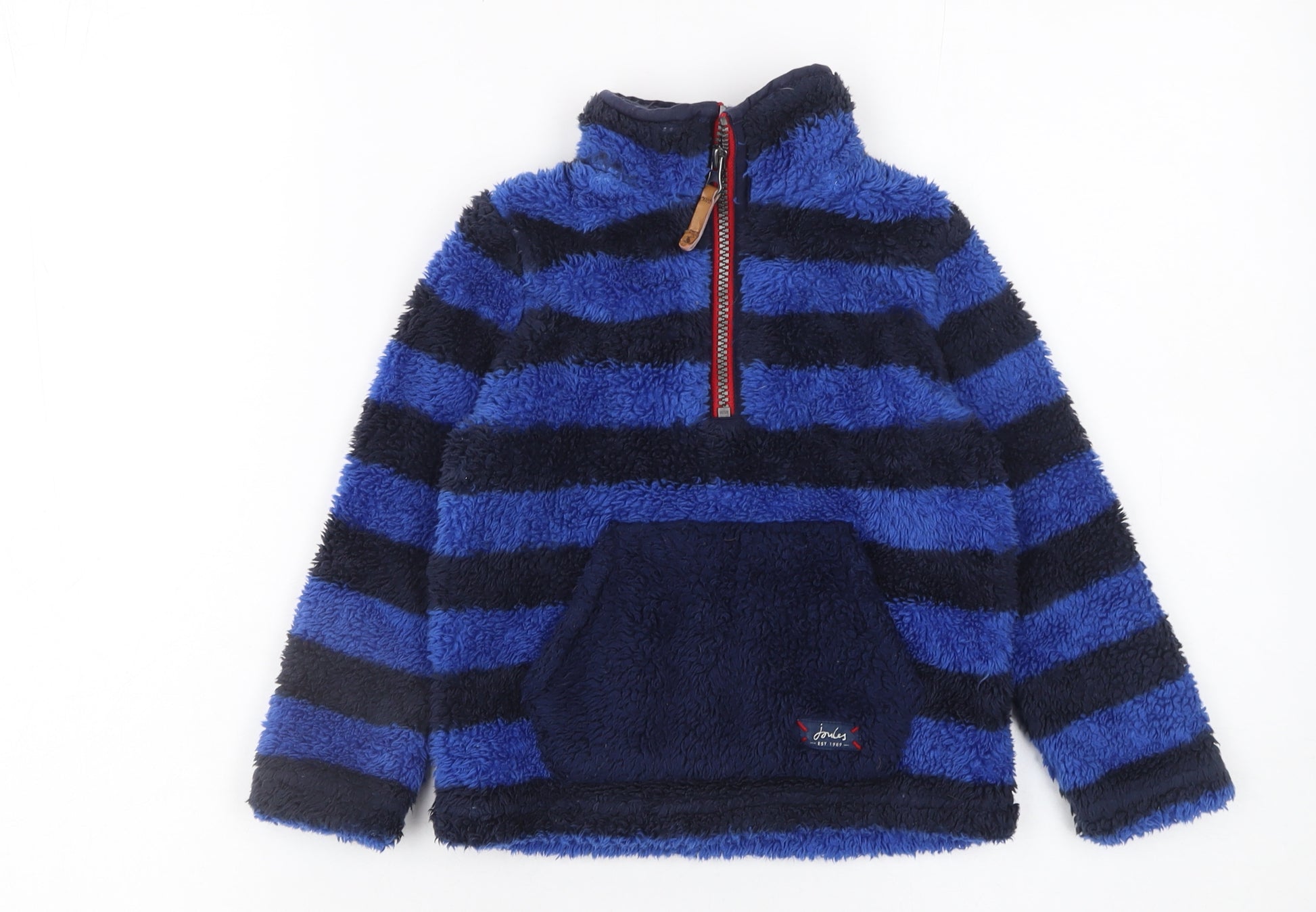 Wrap your little one up warmly with this cosy Joules boys’ striped fleece jacket, perfect for active adventures on cooler days. Designed in soft and fluffy blue and navy stripes, this fleece offers outstanding warmth and comfort while maintaining that classic Joules charm. The 1/4 zip front, complete with a sturdy red zip and leather pull tab, makes it easy for little hands to put on and take off. A large kangaroo-style pocket provides space for keeping hands toasty or storing small treasures found on outdoor explorations. Crafted from 100% polyester, this fleece is soft to the touch, durable, and easy to care for – simply pop it into the washing machine and it’s ready to wear again. The cleverly designed fit ensures freedom of movement, making it ideal for school runs, playground fun, or family strolls in the park. The lined interior offers added comfort, making it a reliable layering piece under a coat or perfect on its own for autumn and winter wear. The zipped neckline helps lock in warmth while adding a touch of practicality and style. Joules’ signature detailing at the hem delivers the quality and personality the brand is known for. This jacket has been gently used and remains in excellent condition with no visible marks or signs of heavy wear. Offering the perfect mix of warmth, softness, and durability, it’s an ideal pick for any outdoor-loving youngster. Keep your child snug, stylish, and ready for adventure with this timeless Joules fleece that’s sure to be worn over and over again across the seasons.
