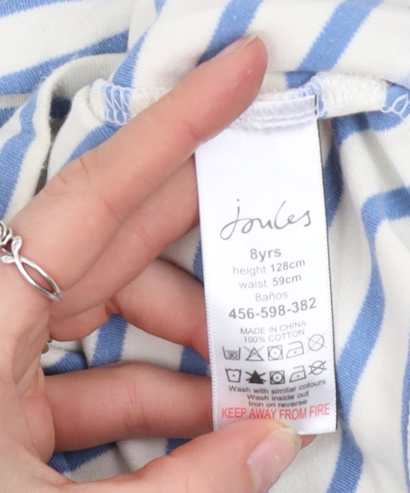 This lovely Joules girls’ long sleeve T-shirt captures the timeless charm of nautical design. In soft blue and white stripes, it’s perfect for creating that effortless seaside style while keeping your young one comfortable throughout the day. Crafted from 100% cotton, the fabric feels beautifully soft against the skin and is lightweight and breathable, making it ideal for spring and summer wear. The boat neckline and regular fit offer a relaxed silhouette that pairs easily with shorts, jeans or skirts. The quality craftsmanship that Joules is known for ensures lasting durability, while the branded logo detail at the hem adds a subtle designer finish. Stylish button accents on the shoulders add a touch of detail and practicality. Measuring approximately 60 cm at the chest, this size 8 years top is ideal for everyday play, school, or casual outings. Though gently pre-loved, it remains in good condition with a small, light stain on the front and minimal overall wear. There are no tears or damage, and the fabric’s structure remains soft and resilient. This Joules T-shirt is machine washable for easy care, standing up to repeated washes while maintaining its comfort and quality. Perfect for young explorers, it embraces a nautical, marine theme that’s wonderfully versatile for layering on cooler days or wearing solo when the sun shines. Pair it with denim shorts or leggings for a fun, casual outfit that’s ready for adventure. Joules, a trusted British brand, always delivers premium-grade clothing that blends vibrant style with reliable comfort – and this T-shirt is no exception. Affordable, stylish, and practical, it’s a wardrobe essential every child will love to wear again and again.