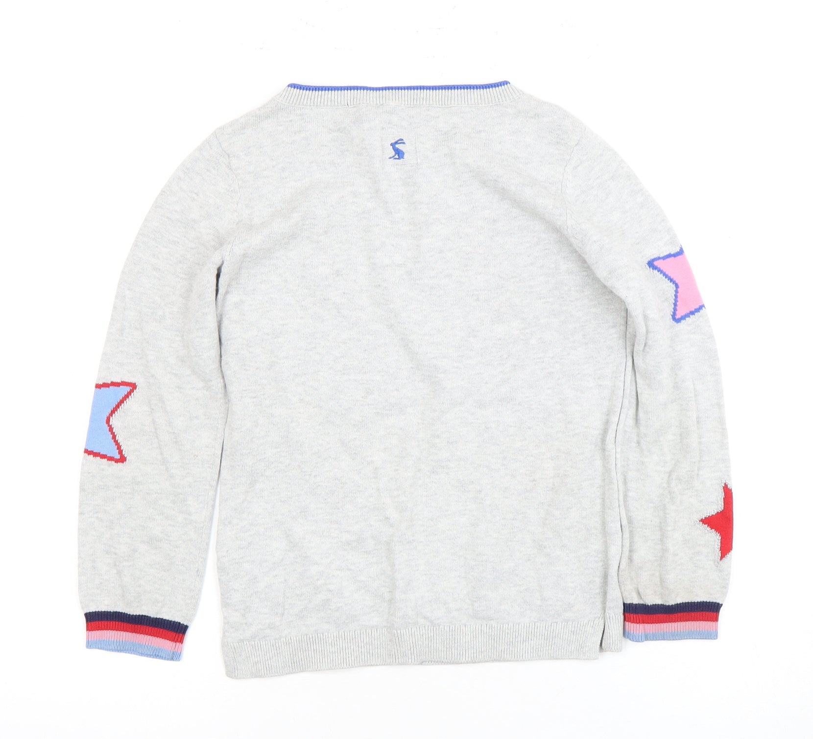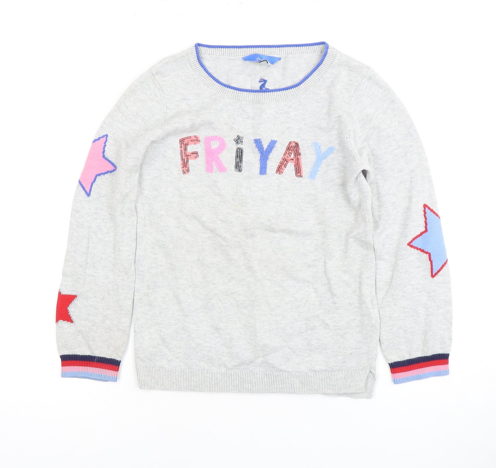 Brighten up your child's wardrobe with this playful Joules Girls Grey Pullover Jumper, perfect for the stylish young one in your life. Crafted from 100% cotton, this jumper promises a comfortable and breathable wear, ideal for both spring and autumn. The charming embroidered 'FRIYAY' lettering on the front, accompanied by vibrant star motifs on the sleeves, makes it a fun addition to casual outfits. Designed for girls aged 7-8 years, this long-sleeve knit features a classic crew neckline, offering a versatile style that pairs well with jeans or skirts. Lightweight and machine washable, it ensures ease of care and durability for everyday wear. Whether she's heading to school or enjoying a weekend adventure, this Jumper by Joules stands out with its cheerful design and high-quality craftsmanship. Don't miss out on this excellent condition jumper that surely will be a favourite in her closet.