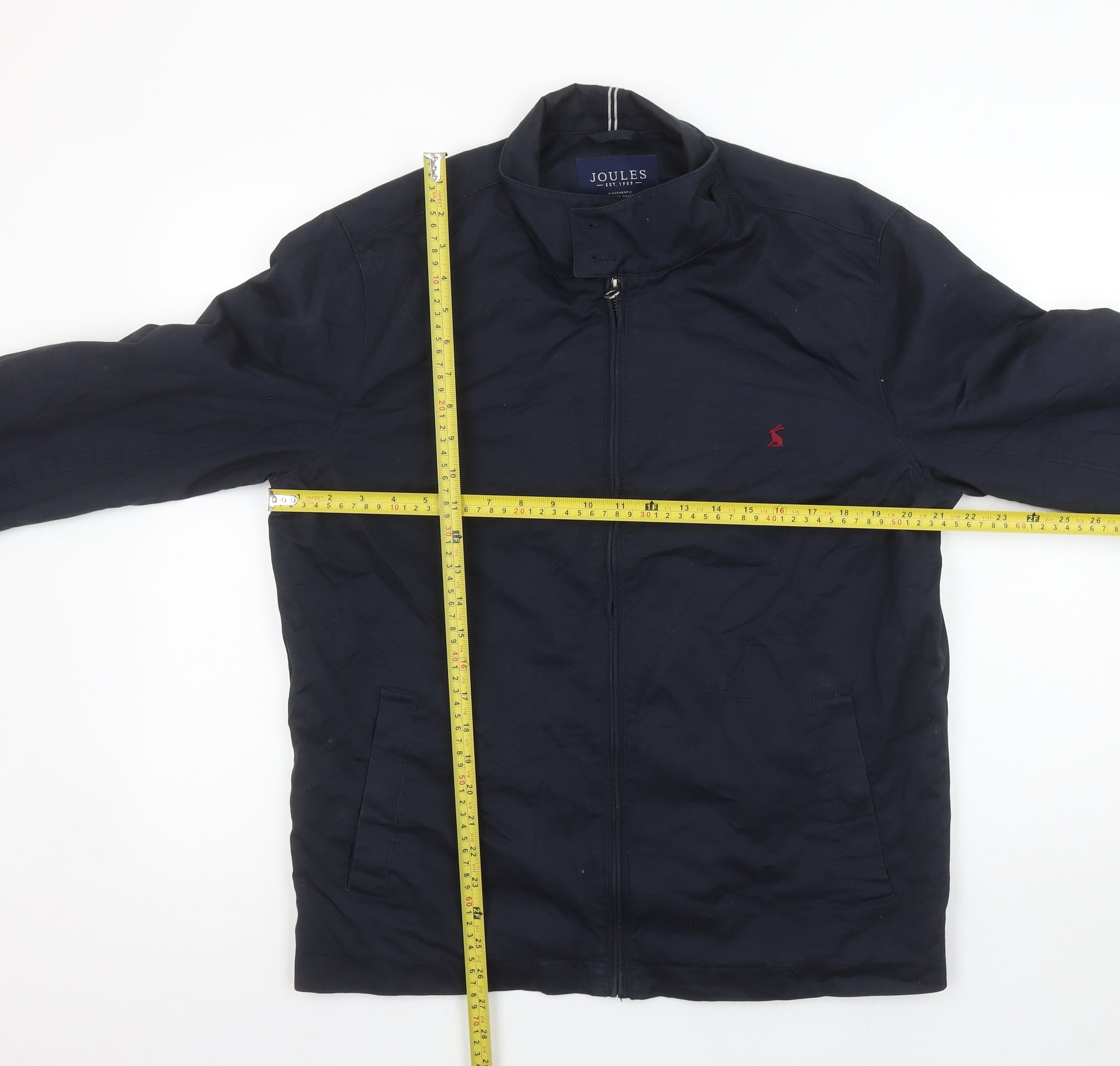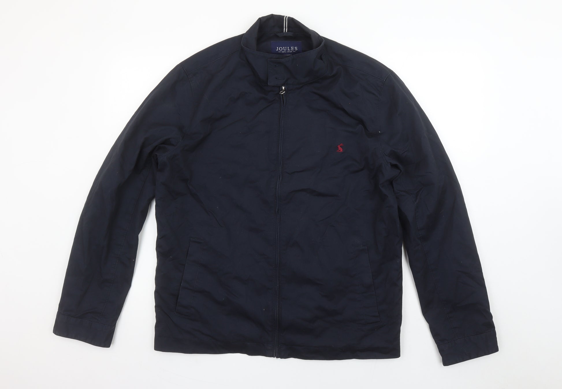 This Joules men's navy zip-up jacket offers classic British casual style with a focus on practicality and comfort. Crafted from 100% cotton for breathability and everyday wear, it’s designed in a versatile mid-length cut with a regular fit that ensures an easy layering option. The soft yet durable cotton construction gives it a lightweight feel, making it an essential outerwear piece for spring and autumn. The jacket features a stand-up collar, full front zip closure, and practical side pockets for convenience. Joules’ signature embroidered hare logo in red adds a subtle touch of heritage branding to the understated navy exterior. The interior is fully lined with cotton and polyester for added comfort, ensuring a smooth finish against inner clothing layers. Perfect for casual occasions, travel, or weekend outings, this jacket pairs easily with chinos, jeans, or smart-casual trousers. It’s ideal for men who value both functional and effortless style. Despite light signs of previous wear, it remains in very good condition with plenty of life left, reflecting the quality craftsmanship Joules is known for. Machine washable and easy to maintain, this jacket is both stylish and practical, perfect for everyday use across seasons. Ideal for those seeking reliable, smart-casual outerwear with timeless appeal.