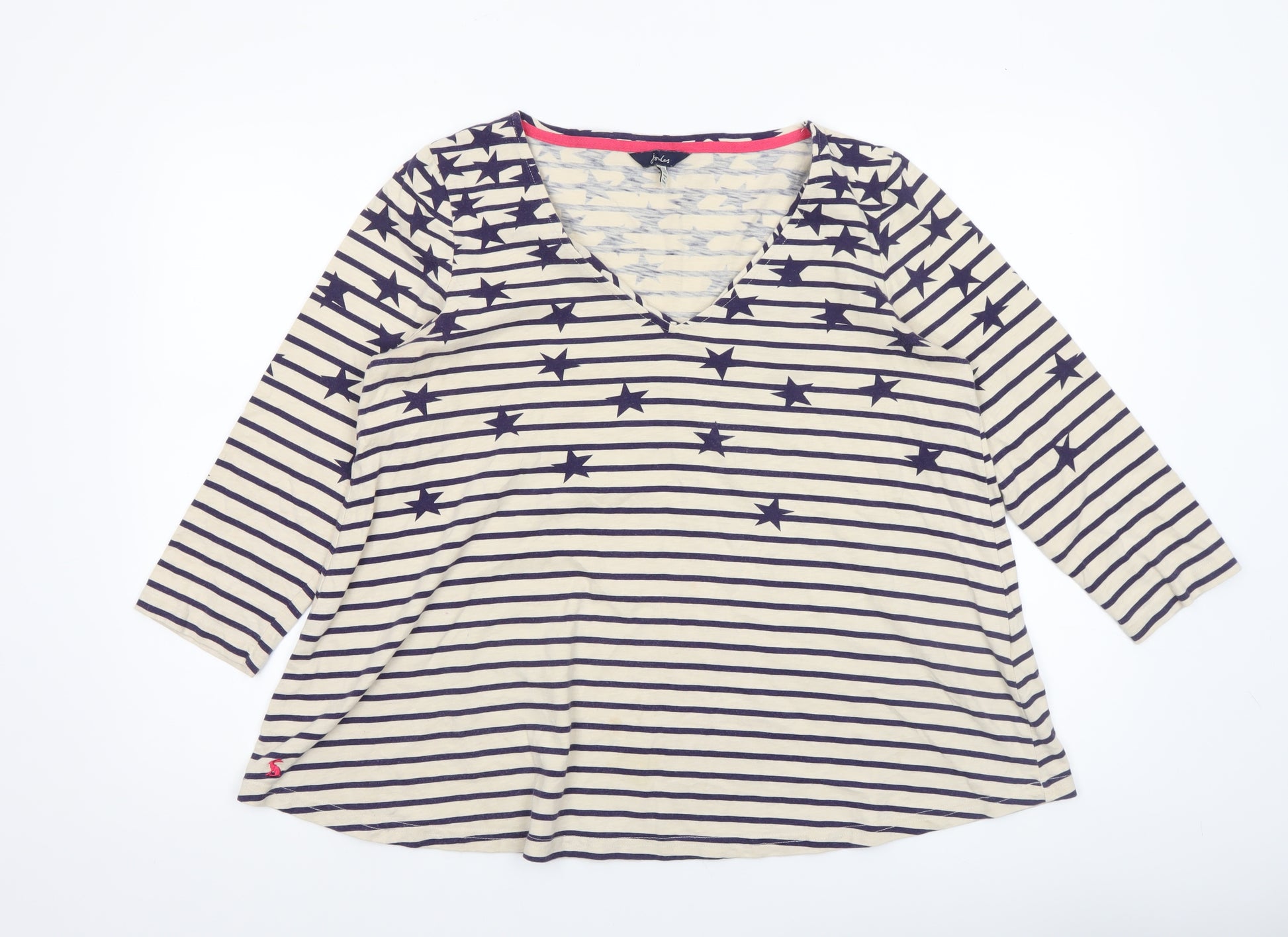 Add a touch of casual charm to your wardrobe with this Joules Women’s Striped Star V-Neck Cotton T-Shirt. Crafted from 100% soft, breathable cotton, this beautifully lightweight top is perfect for everyday wear. The beige background is accentuated by navy horizontal stripes and star detailing for a playful nautical-inspired look. Its flattering V-neckline and 3/4 length sleeves make it ideal for layering or wearing solo in milder weather. Designed in a regular fit with a pullover style, this Joules top offers effortless comfort and easy movement, making it well-suited for spring or summer outings. The cotton jersey fabric ensures lasting comfort, while the easy-care, machine-washable construction makes it practical for daily wear. Pair it with jeans, shorts, or capri trousers for a relaxed, laid-back style that transitions easily from day to evening. The top is a UK size 12, offering a comfortable fit for most body shapes. In excellent pre-owned condition, it shows only minor fabric softening consistent with gentle use, maintaining its premium quality and charm. Whether you’re heading for a seaside stroll, meeting friends for lunch, or simply relaxing at home, this top delivers casual elegance and timeless appeal. Ideal for women who appreciate classic yet playful designs, this Joules striped star tee effortlessly combines comfort and style, making it a wardrobe staple you’ll reach for again and again.