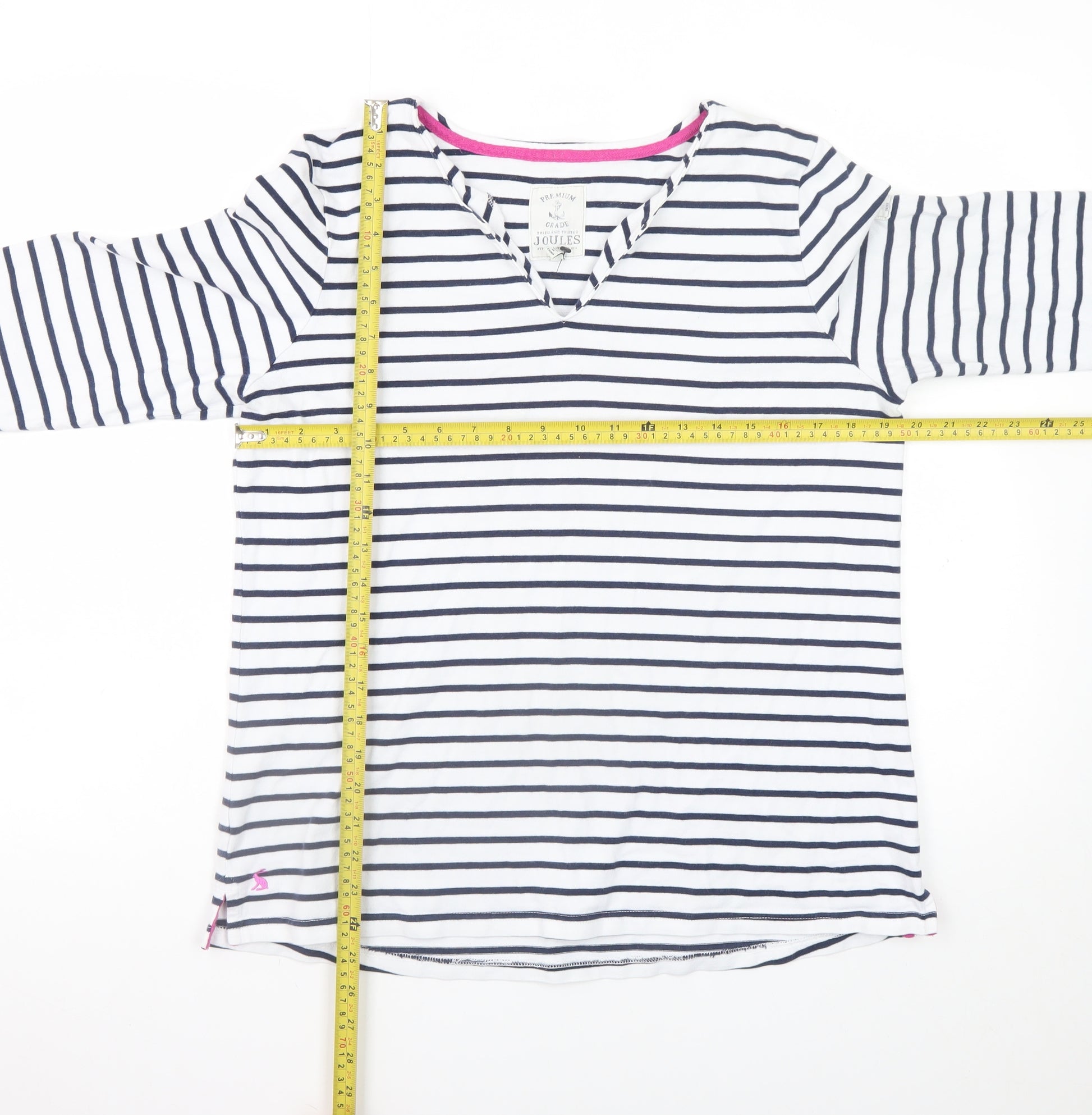 This Joules women’s pullover sweatshirt brings nautical charm and casual comfort together in one effortlessly stylish top. Crafted from 100% cotton jersey, the soft and breathable fabric makes it perfect for all seasons — light enough for warmer days yet cosy enough for layering when temperatures drop. The classic navy and white horizontal stripe pattern is quintessentially maritime, complemented by subtle pink detailing at the inner neckline and side splits for a feminine touch. Featuring a flattering V-neck and three-quarter sleeves, it offers both versatility and ease of wear for everyday dressing. The regular fit ensures comfort and an easy silhouette that pairs beautifully with jeans, shorts, or skirts. Whether enjoyed during seaside strolls, relaxed weekends, or casual outings, this Joules sweatshirt adds timeless coastal flair to your wardrobe. In excellent pre-loved condition with no visible flaws or damage, it has been gently worn and well cared for. Machine washable for simple upkeep, it’s both stylish and practical. Ideal for spring, summer, or autumn layering, this top embodies Joules’ signature blend of quality, comfort, and nautical-inspired design. A must-have piece for those who love laid-back British style with a hint of playful detailing.