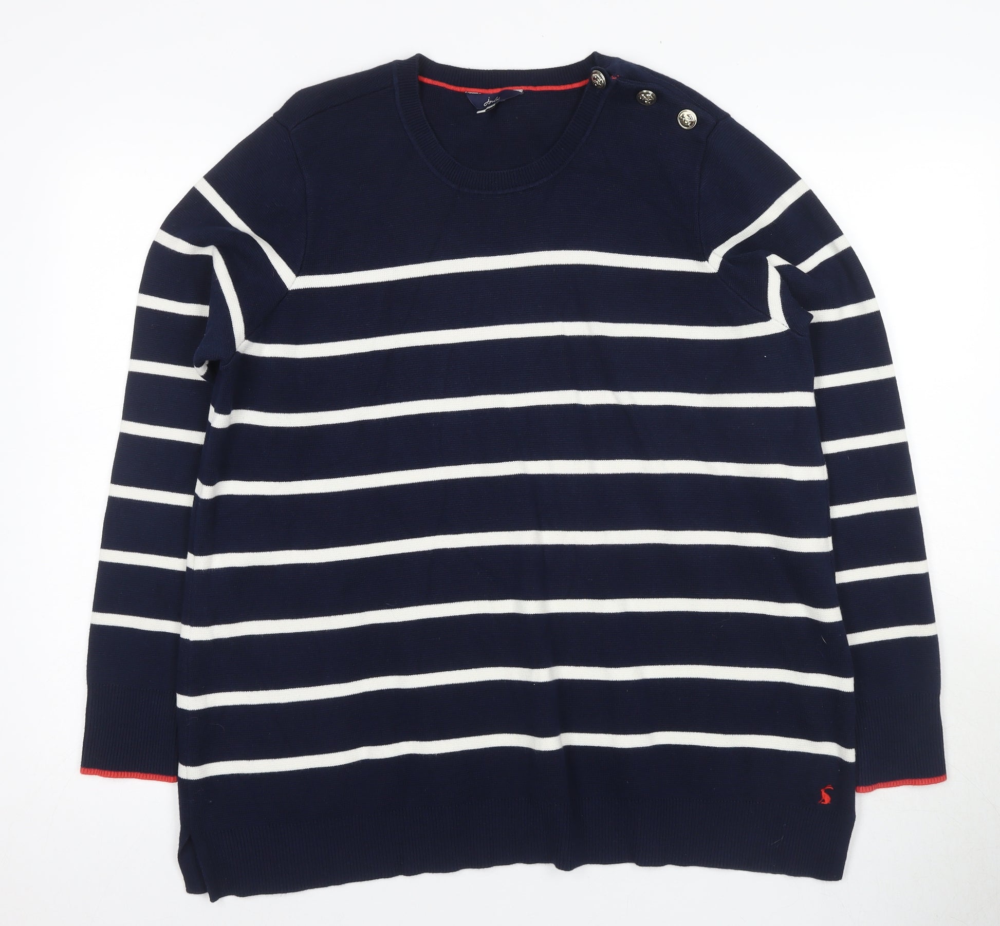 Experience ultimate comfort and style with this Joules Women's Blue Long Sleeve Striped T-Shirt. Crafted in a regular fit, this casual top features a classic crew neckline and is enhanced with elegant button accents on the shoulder. Made from 100% soft cotton and a touch of elastane for flexibility, this jersey fabric top provides all-day comfort and is perfect for all seasons. Its chic striped pattern in striking blue offers a timeless and versatile look, making it an ideal choice for pairing with your favourite jeans or skirt. Designed for convenience and practicality, it is machine washable, ensuring your vibrant look stays fresh throughout wear. Elevate your wardrobe with this quality piece, perfect for casual and relaxed settings.