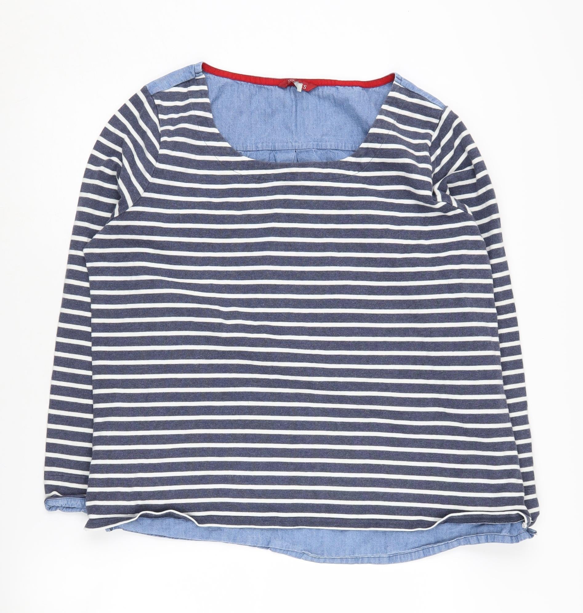 Embrace effortless style with this Joules Women's Blue Striped T-Shirt, perfect for adding a touch of casual elegance to your wardrobe. Crafted from high-quality 100% cotton, this T-Shirt ensures maximum comfort and breathability, making it ideal for the warmer months of spring, summer, and autumn. The classic striped pattern in a versatile blue hue pairs effortlessly with a variety of outfits, from your favourite jeans to a stylish skirt.Featuring long sleeves and a round neckline, this T-Shirt offers a relaxed fit that provides comfort without compromising on style. The lightweight jersey fabric adds to the easy-wear feel, making it a staple piece for any casual occasion. Whether you're heading out for a relaxed day in town or simply enjoying time at home, this T-Shirt from Joules promises to be a dependable choice.With its regular fit and breathable design, it's a perfect option for those who appreciate both style and comfort. The item is machine washable for easy care, allowing you to enjoy its timeless appeal season after season. Though pre-loved, this T-Shirt is in excellent condition, reflecting minimal wear that speaks to its quality and durability.Add a classic and versatile piece to your wardrobe with this Joules Women's Blue Striped T-Shirt. Its combination of comfort, style, and practicality ensures it will soon become a favourite item in your daily rotation.