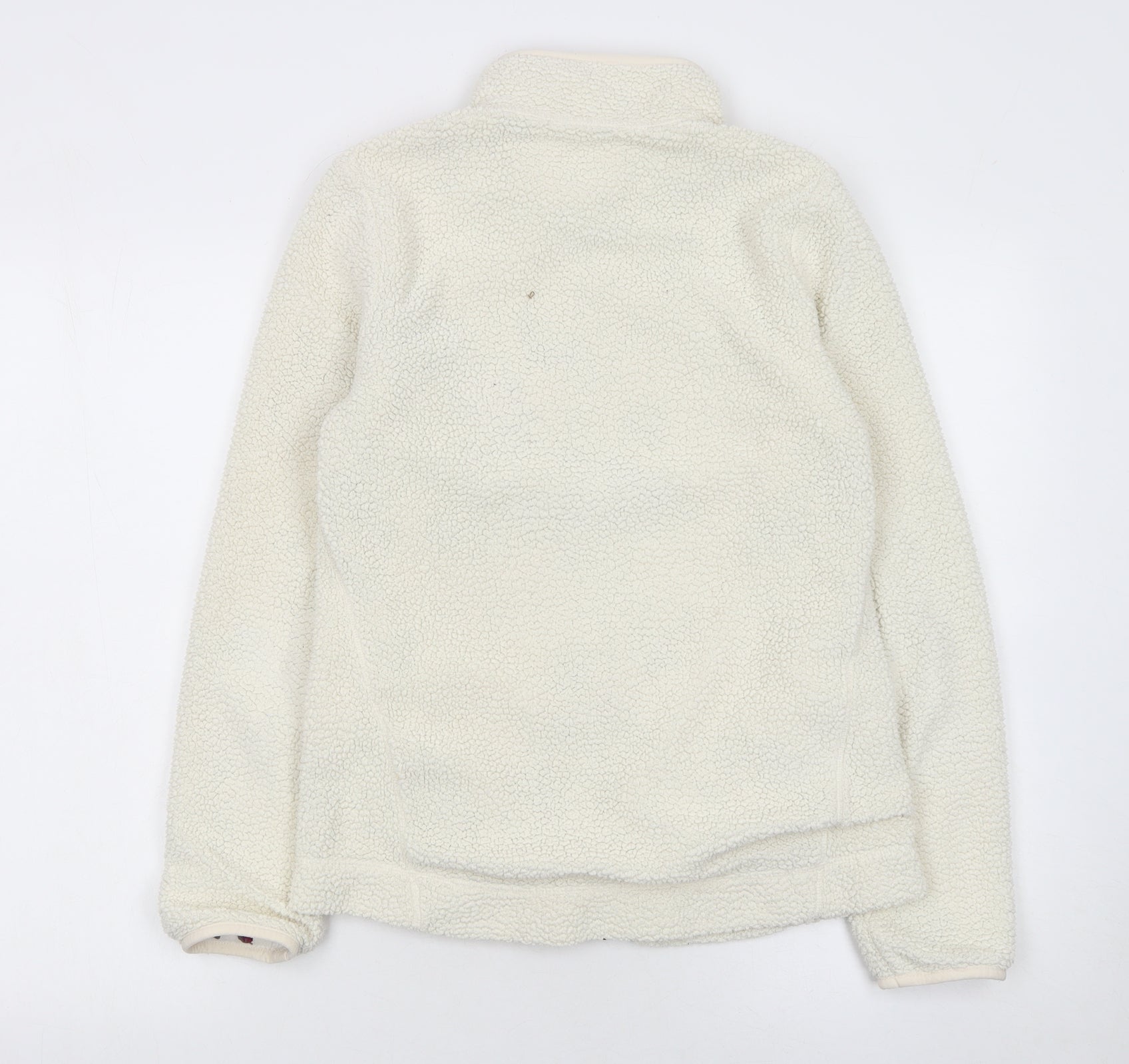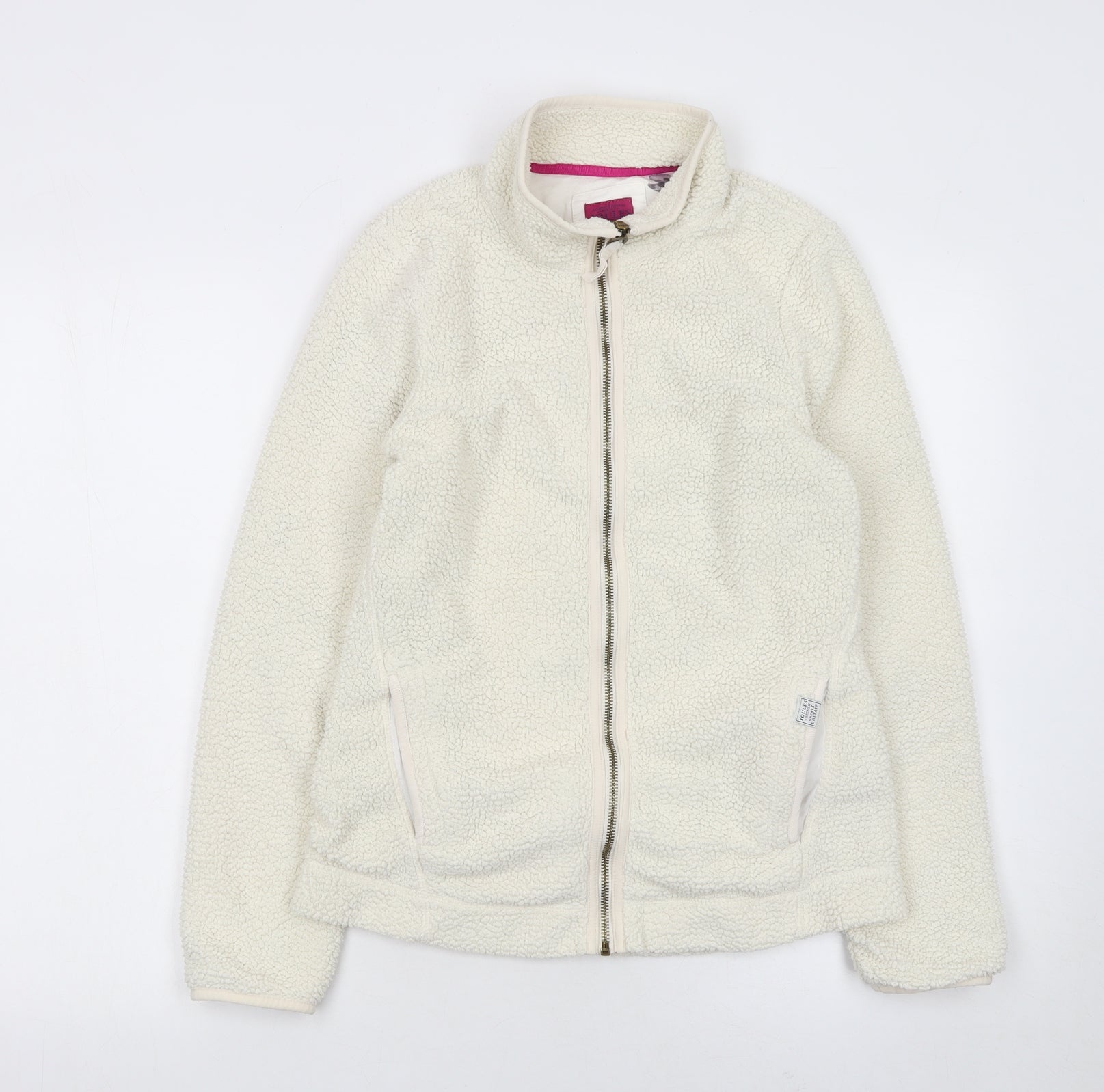 This Joules women’s ivory fleece jacket offers a cosy, casual style ideal for the cooler seasons. Crafted from a soft 100% polyester outer shell, it provides a fluffy, textured feel that keeps you warm and comfortable. Inside, the 100% cotton lining ensures breathability and added comfort. Designed with a classic full front zip, this jacket is both practical and stylish, making it easy to layer over other outfits. Two convenient side pockets add functionality, giving you space to keep essentials close at hand or to warm your hands on chilly days. The jacket’s regular fit and short length make it flattering and versatile, suitable for a wide range of casual occasions — from outdoor walks to relaxing weekends. With its neutral ivory colour, it pairs effortlessly with jeans, leggings, or casual trousers, while the soft fleece fabric gives a snug and relaxed look. Perfect for autumn and winter wear, this Joules fleece jacket blends warmth with understated elegance. In very good condition, with only a small mark visible on the back fabric, it remains in great shape and ready to complement your everyday wardrobe. Easy to care for and machine washable, this timeless Joules piece provides both style and practicality, embodying the brand’s signature quality and British charm. A must-have for anyone seeking comfort, warmth, and casual sophistication throughout the cooler seasons.