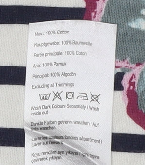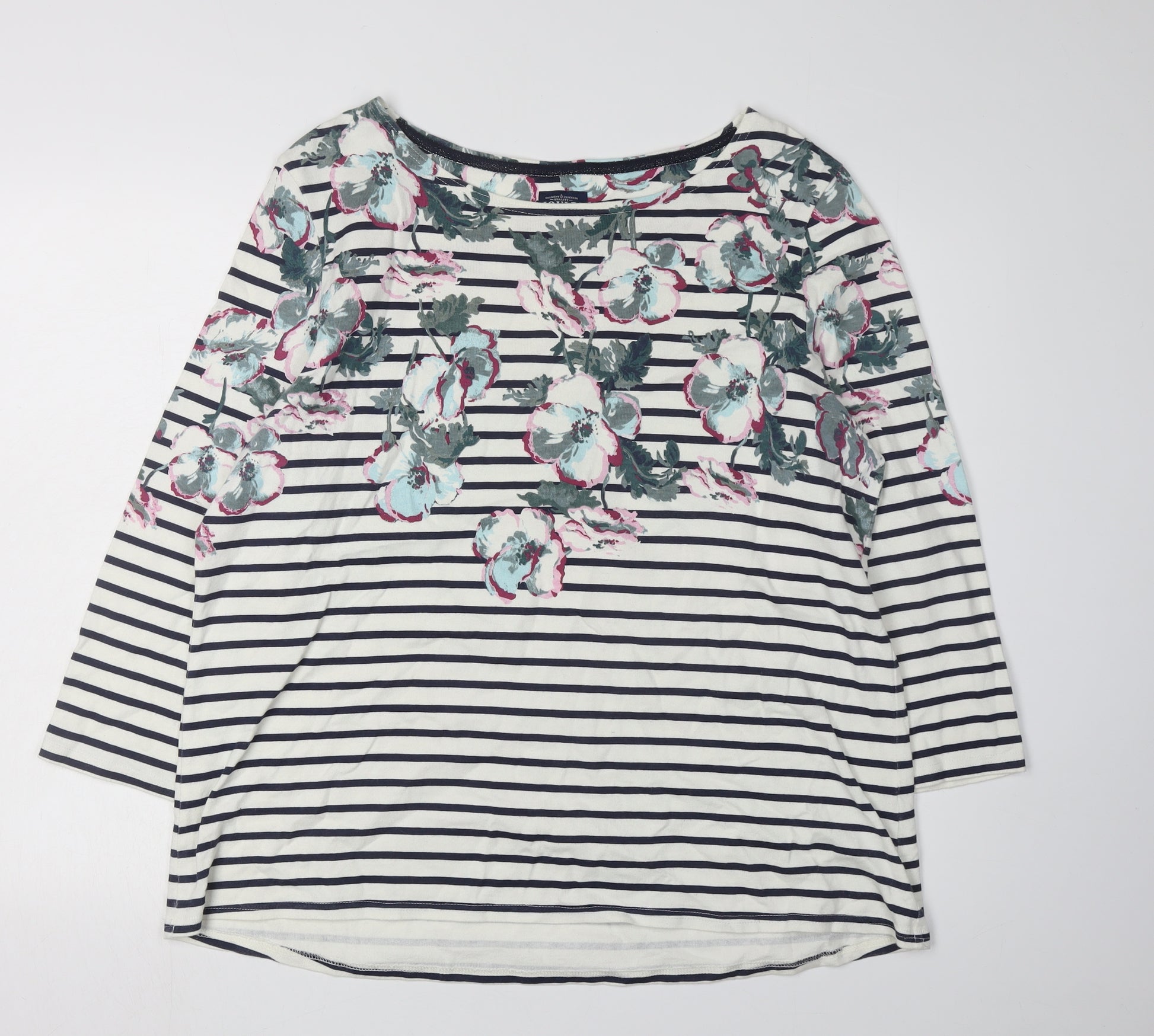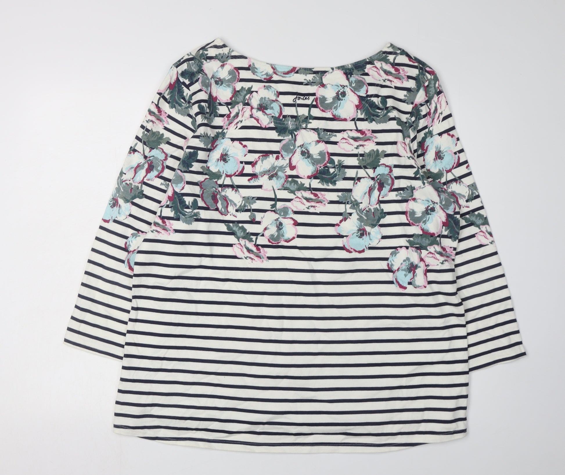 Embrace effortless style with this Joules women's top in a striking multicoloured design. Perfectly tailored for women, this top is crafted from 100% cotton, ensuring breathability and comfort. The captivating combination of floral and striped patterns adds a touch of elegance, making it an ideal choice for casual wear during spring and summer. Featuring a boat neckline and 3/4 sleeves, it offers a flattering fit for any body type. The machine washable fabric ensures easy maintenance. In excellent condition, this top is perfect for any casual occasion, promising both style and comfort. A must-have addition to your wardrobe, it pairs beautifully with your favourite jeans or a skirt for a chic, laid-back look.