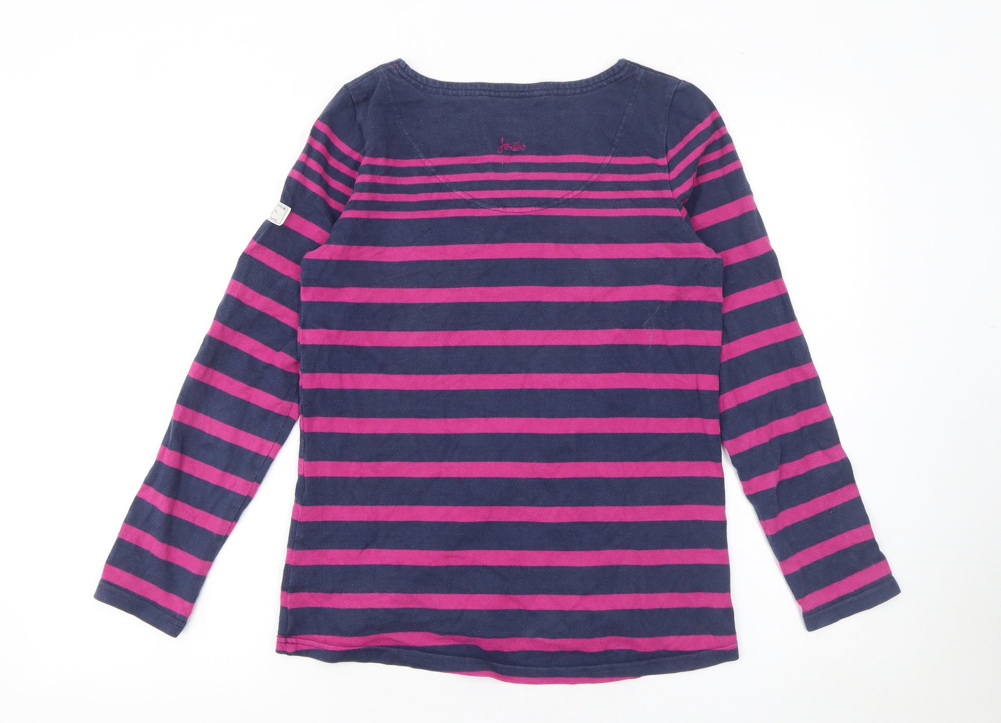 This Joules women's long sleeve striped top is a timeless favourite combining comfort, quality, and classic nautical charm. Crafted from 100% cotton, the fabric feels soft and breathable, making it ideal for all-day wear across the seasons. The jersey texture helps the top drape beautifully while maintaining comfort and ease of movement. The navy base is contrasted by vibrant pink stripes, creating a cheerful, modern twist on maritime-inspired design. Styled with a flattering boat neckline and regular fit, this top is the perfect blend of casual and chic, offering both versatility and effortless appeal. The long sleeves make it a great transitional piece ideal for layering under jackets or wearing alone during spring and autumn days. A premium-grade design, it reflects the tried and trusted quality Joules is known for—perfectly suited for relaxed weekends, coffee dates, or countryside strolls. Excluding all trimmings, this piece embodies everyday practicality and timeless appeal. In very good pre-loved condition, this top shows only minimal signs of wear with very slight lint visible, reflecting gentle previous use but maintaining excellent overall quality and vibrancy. Whether styled with jeans for a laid-back weekend look or layered under a gilet for added warmth, it delivers comfortable and durable wear. Easy to care for, this machine washable piece is an everyday essential for any modern wardrobe, reflecting Joules' blend of functionality and timeless British design elegance. With its clean pullover construction, breathable cotton fabric, and iconic stripe pattern, it's a wardrobe staple that promises enduring style and comfort every time you wear it.
