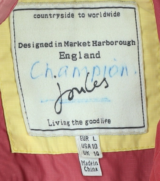 Stay stylish even on rainy days with this Joules Women's Rain Coat in a fresh pink hue. Perfect for women who love a combination of fashion and functionality, this regular-sized jacket is meticulously crafted to keep you dry and comfortable during spring and summer showers. Featuring a durable outer shell made from polyamide and polyurethane, the coat ensures ultimate waterproof protection. The long sleeves and hood provide additional coverage, making it an ideal choice for outdoor adventures, casual outings, or travel plans. The classic zip closure offers convenience and ease, while the breathable polyester lining enhances comfort on warmer days. Despite being gently used, this coat remains in excellent condition with no visible wear or damage, promising a long-lasting addition to your wardrobe. With its minimalist no-pattern design, this rain coat will easily pair with various outfits, making it a versatile piece to own. Priced attractively, this jacket is a must-have for anyone seeking practical yet stylish outerwear. Its machine-washable feature further adds to its appeal, ensuring easy care and maintenance. Whether you're heading to the countryside or navigating through city streets, this Joules rain coat will be your trusty companion.