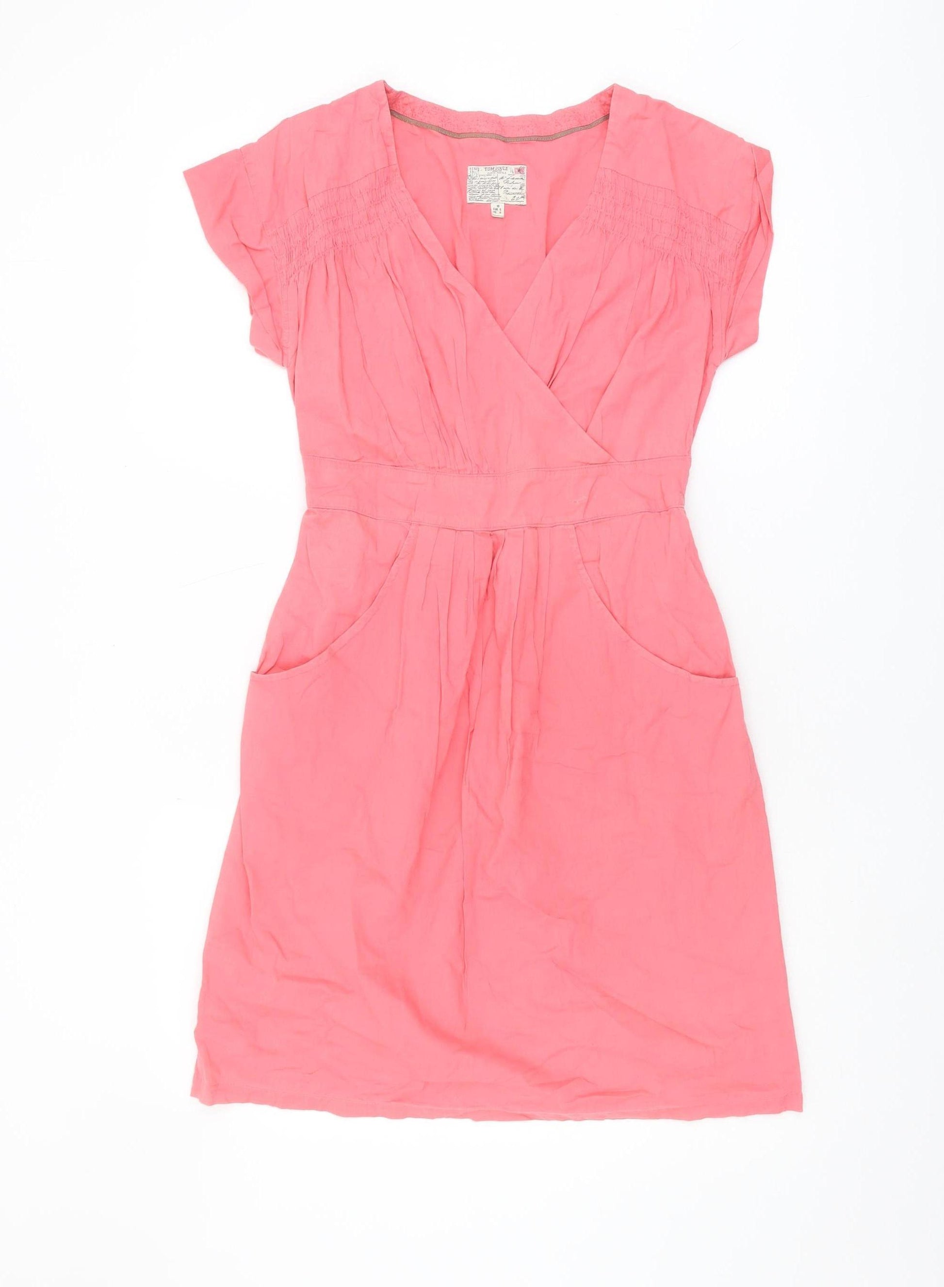 Step into spring with this delightful pink wrap dress from Joules, perfect for adding a splash of colour to your wardrobe. Designed with a flattering V-neckline and chic cap sleeves, it embodies effortless elegance and charm. Tailored for a comfortable and relaxed fit, this knee-length dress is ideal for casual outings or social gatherings during the warmer months. Crafted from 100% cotton, it promises breathable comfort and is machine washable for easy care. Despite minor wrinkles, this dress is in excellent condition, offering a fresh, playful look. The simple yet stylish design allows you to accessorise freely, making it a versatile addition to any woman's collection. Embrace the season with confidence and flair in this must-have Joules dress.