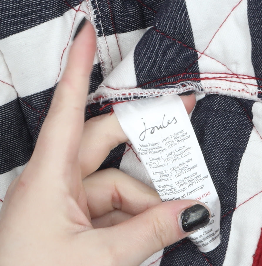 This elegant red quilted jacket by Joules offers a timeless blend of British countryside style and modern comfort. Designed for women, this mid-length jacket features classic diamond quilting for an effortlessly sophisticated look. Crafted from 100% polyester, the durable outer shell provides both warmth and durability, while the soft cotton and polyester lining ensures a comfortable feel against the skin. The jacket includes practical features such as front pockets for added convenience and a belted waist to accentuate your silhouette. Its button and zip closure combination adds a secure and stylish finish, while the long sleeves and high neckline give ample protection against the cold weather. Perfect for everyday wear during autumn and winter, this jacket is ideal for outdoor walks, country outings, or casual city days. The deep red hue complements any wardrobe, adding a pop of colour that is both fashionable and versatile. Suitable for layering, this Joules jacket reflects the brand’s heritage of British practicality blended with chic design. In excellent used condition, this piece shows light signs of careful wear but remains clean and well-kept. It’s a wonderful option for those seeking a quality jacket that balances elegance, function, and warmth. Machine washable for easy care, this mid-length quilted style promises to be a favourite year after year. Ideal for casual or travel occasions, the Joules Red Quilted Belted Jacket embodies everyday luxury, making it a must-have addition to any woman’s outerwear collection.