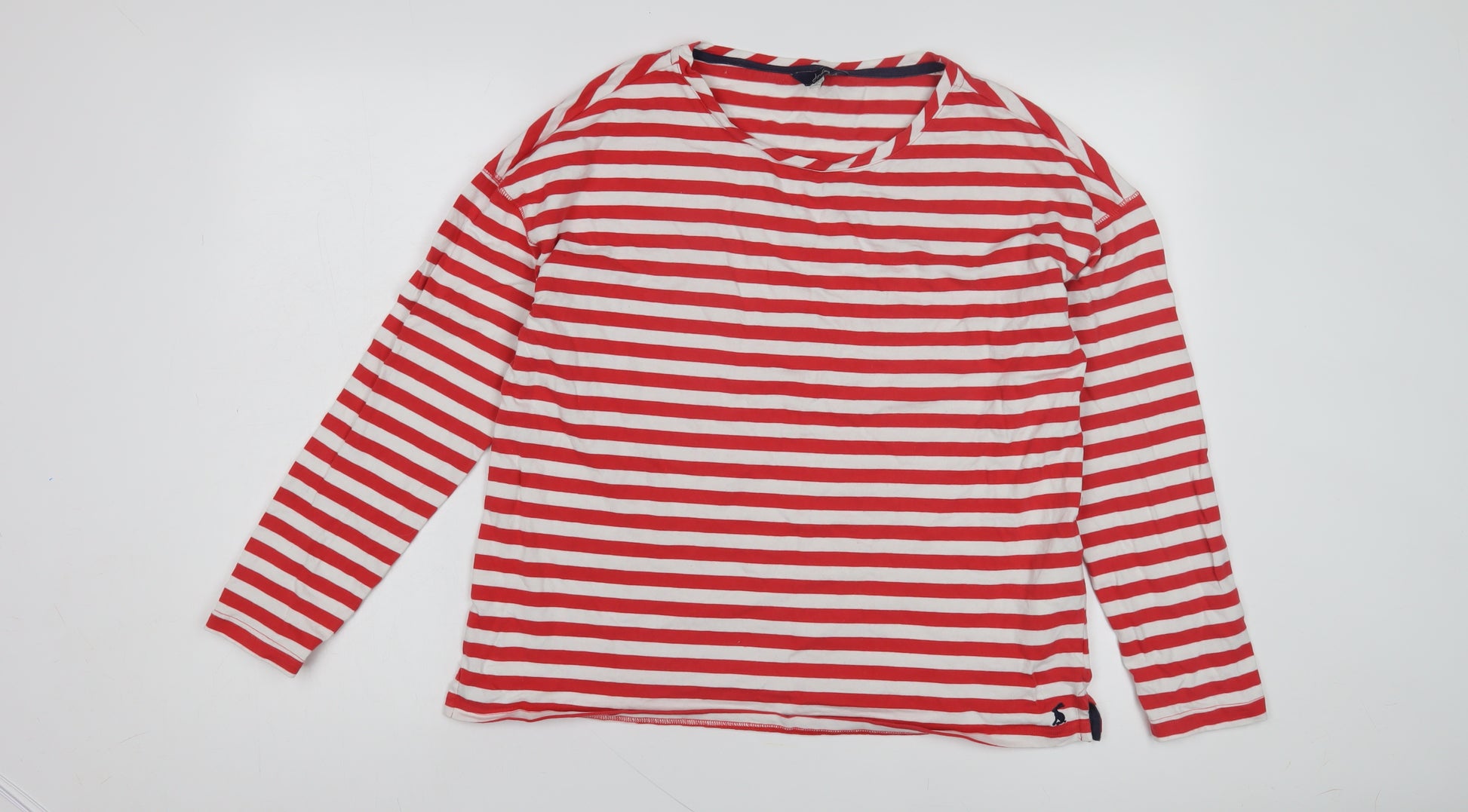Elevate your casual wardrobe with this comfortable and stylish Joules women's T-Shirt. Made from 100% cotton jersey, it offers a soft touch and breathable fabric perfect for all-day wear. The red and white striped pattern adds a classic touch, making it versatile for various occasions. Its crew neck and long sleeves provide a timeless silhouette, ensuring you stay chic yet relaxed. Ideal for casual outings, this T-shirt pairs well with jeans or skirts, offering endless styling options. In excellent condition with minimal signs of wear, it's a must-have addition to your collection.