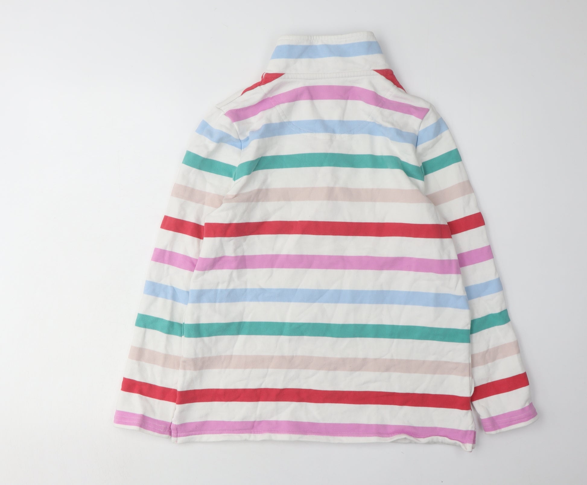 Step out in style with this vibrant Joules Women's Pullover Sweatshirt, perfect for adding a pop of colour to your casual wardrobe. Crafted from a comfortable blend of cotton and polyester, this lightweight sweatshirt offers a cosy and breathable fit, ideal for both spring and autumn wear. The striking multicoloured striped pattern adds a fun and playful touch to your outfit, ensuring you'll stand out in any crowd. Featuring a high neckline and a convenient 1/4 zip closure, this sweatshirt provides both warmth and versatility, allowing you to adjust your look on cooler days. Designed for a regular fit, it ensures ease of movement, making it an excellent choice for everyday wear. Although pre-owned, the sweatshirt is in very good condition, with slight discolouration visible, adding character to this unique piece. Ideal for casual outings or relaxed weekends, this Joules sweatshirt promises comfort and style in one delightful package. Machine washable for easy care, it is a seamless addition to any fashion-forward woman’s wardrobe.