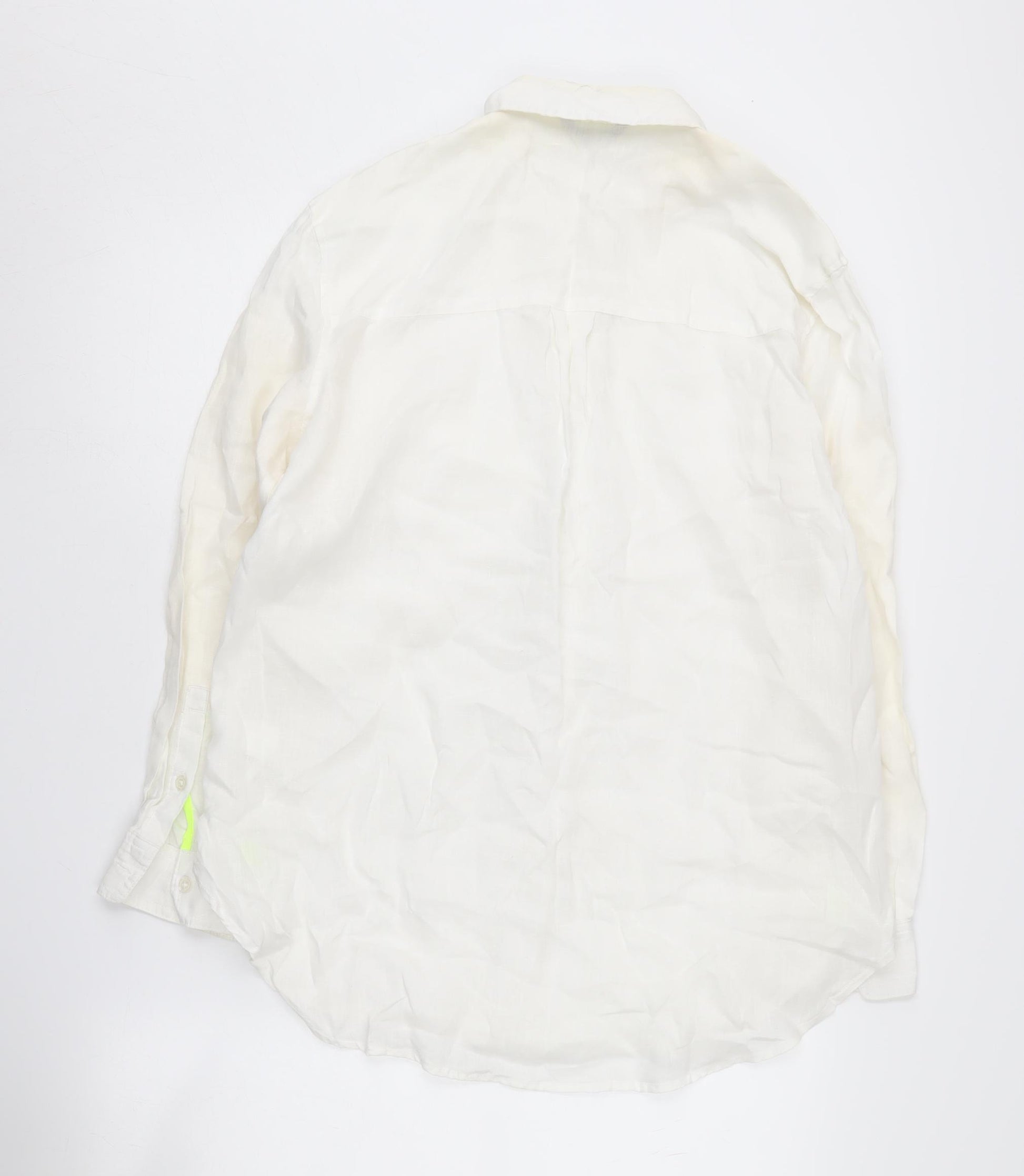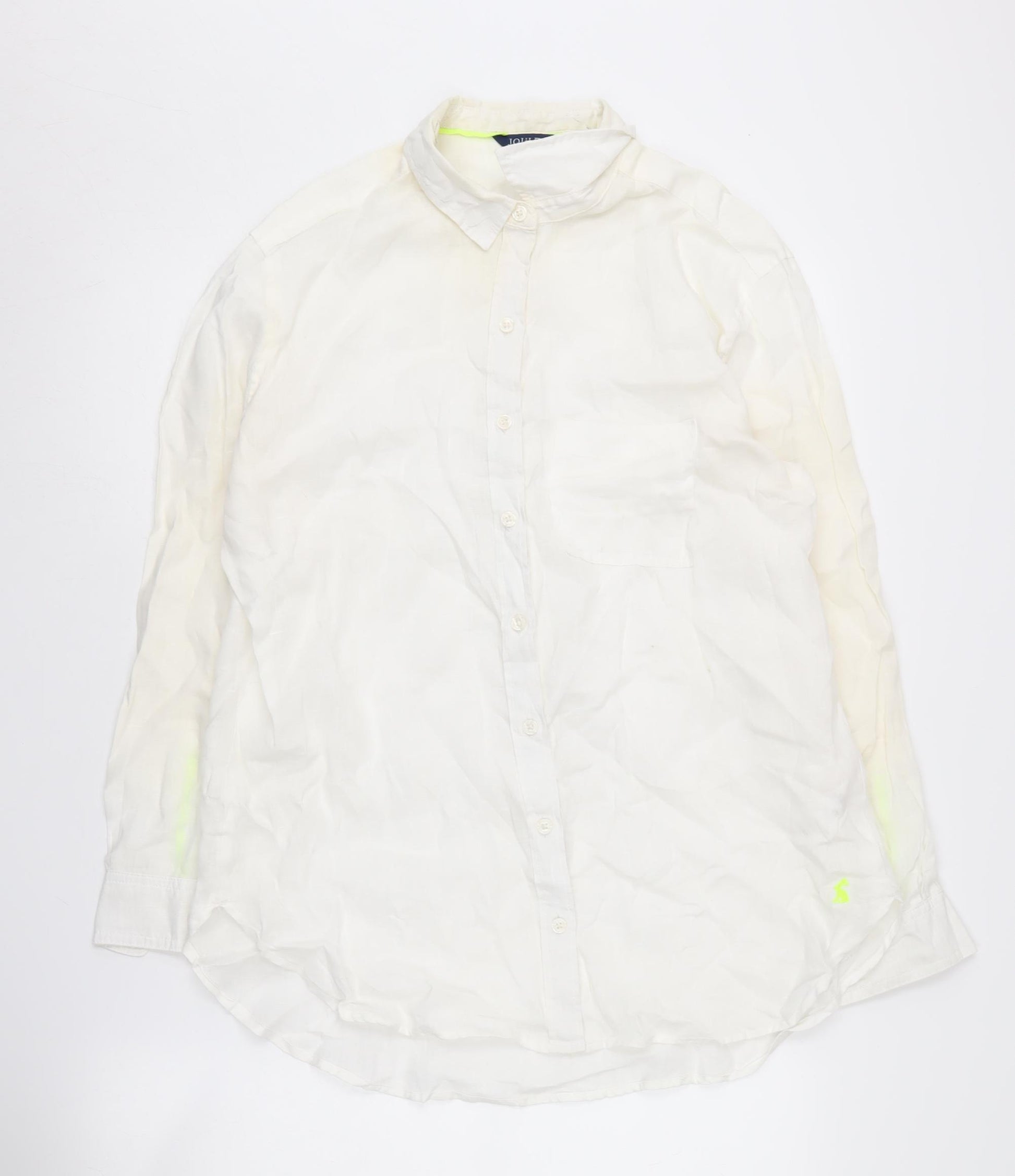 The Joules Women's Button-Up Shirt in classic white offers effortless style with its sleek, collared design. Crafted from 100% flax, this shirt ensures comfort and breathability, making it ideal for various occasions. The long sleeve design adds a touch of elegance, perfect for layering or wearing on its own. Though gently used, the shirt remains in good condition with only light stains observed, promising continued wear. Its solid pattern makes it a versatile addition to any wardrobe, easily paired with jeans for a casual look or dressed up with trousers for a more formal setting. Perfect for the stylish woman who values both comfort and simplicity, this shirt will quickly become a staple in your closet.