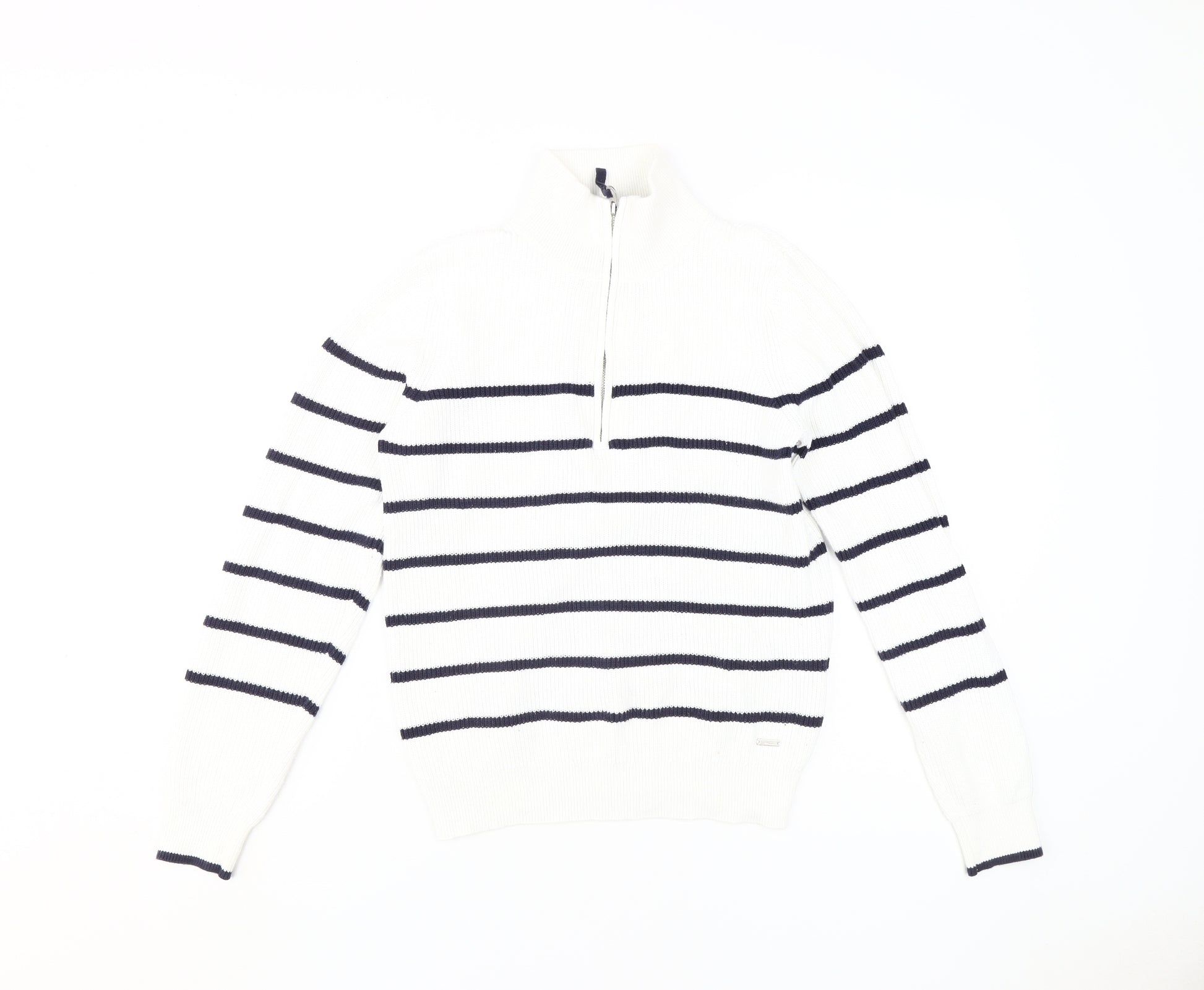 Elevate your casual wardrobe with this chic Joules Women's White Striped Full Zip Jumper, perfect for creating a fresh and stylish look. Crafted from 100% cotton, this jumper ensures both comfort and breathability, making it ideal for year-round wear. The elegant high neck design adds a sophisticated touch while providing warmth, whether layered over a shirt or worn independently. With its distinct black horizontal stripes set against a crisp white background, this jumper is a timeless addition to any fashion-forward collection. Easily pair it with jeans or trousers for a versatile outfit that suits any casual occasion. The convenient 1/2 zip feature allows for adjustable styling, ensuring effortless comfort to suit your preference. Perfect for transitional seasons like Spring and Autumn, this jumper offers lightweight warmth without compromising on style. Brand new with tags, it guarantees impeccable quality and freshness. Make a subtle yet stylish statement with this versatile piece from Joules. Ideal for keeping your look polished and effortlessly trendy.
