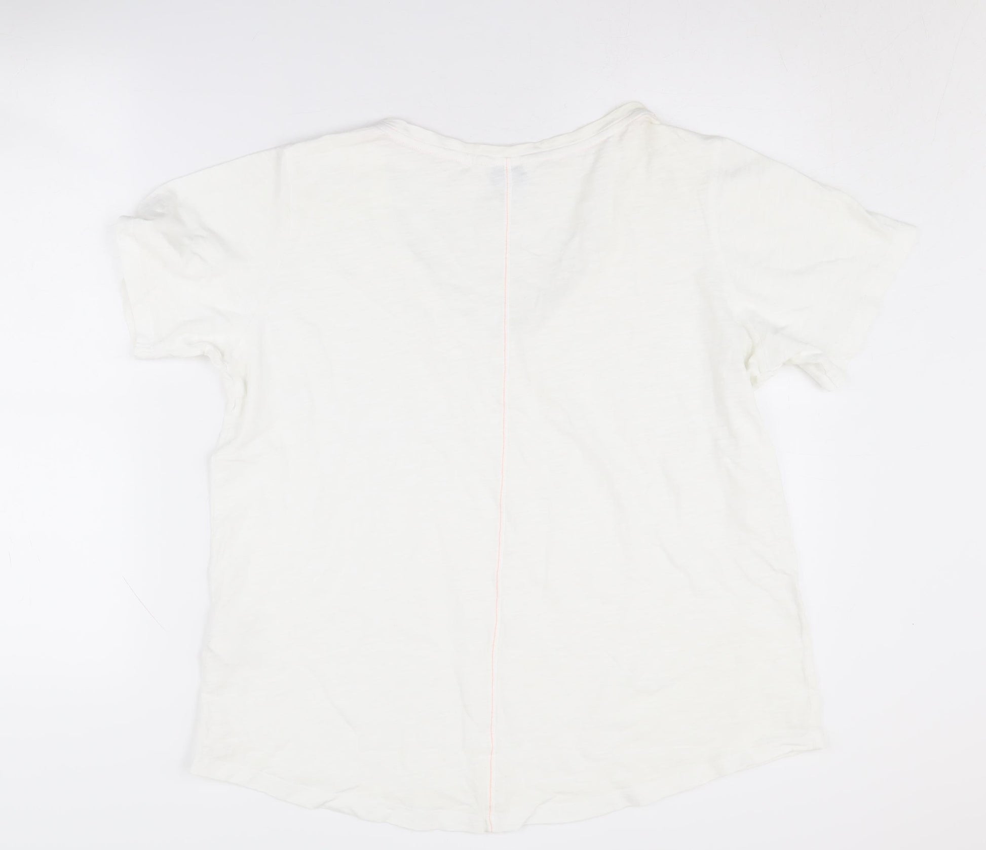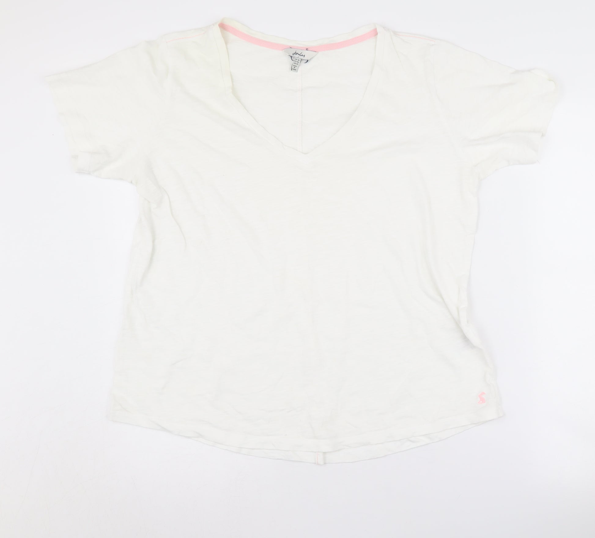 Discover the epitome of casual simplicity with this women's Joules white V-neck T-shirt. Crafted from 100% cotton, it promises unparalleled comfort and breathability, making it an ideal choice for everyday wear. Designed in a regular fit, this short-sleeve basic style ensures effortless pairing with any wardrobe, being both versatile and adaptable across all seasons. The T-shirt, in a solid white hue, exudes an understated elegance that's perfect for a variety of casual occasions. Whether you're heading out for a quick errand or spending a relaxed day at home, this top offers timeless style and ease. The V-neck adds a touch of feminine charm, flattering the neckline and allowing for accessorising as desired. Machine washable for easy care, this Joules T-shirt is a wardrobe staple, blending quality and practicality. Grab this essential piece and experience the soft, durable jersey fabric, accommodating an effortlessly chic look. Although pre-loved, it is maintained in excellent condition with minimal signs of wear, ensuring you enjoy quality without compromise. Enhance your casual collection today with this must-have item.