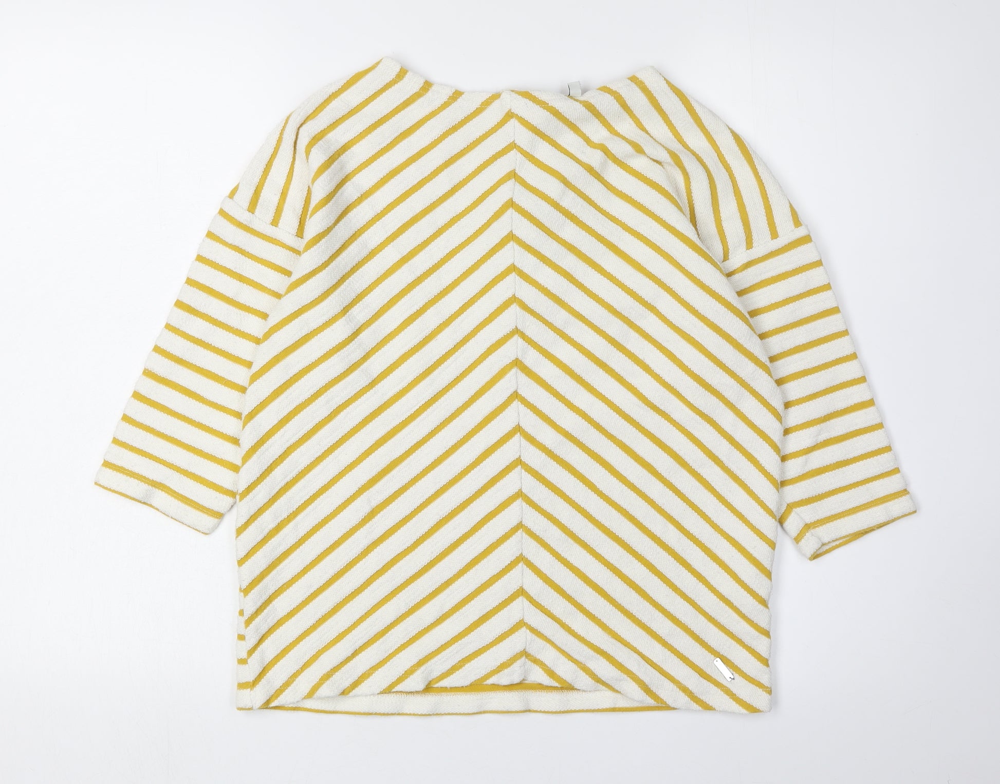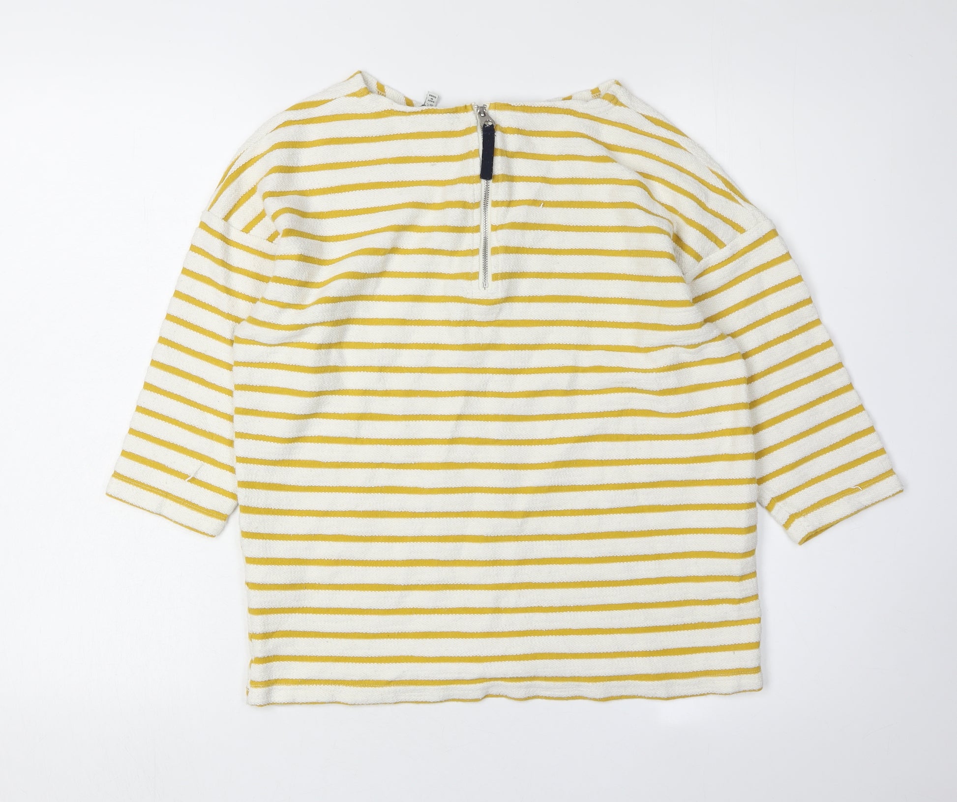 This delightful Joules women's T-shirt brings vibrant stripes in yellow and white, crafted from 100% cotton for breathable comfort. Designed with a boat neckline and 3/4 casual sleeves, this piece offers a relaxed fit perfect for spring and summer days. The back zip accent enhances its simplicity and provides ease of wear. Ideal for casual occasions, this T-shirt presents a regular size UK 8 fit that complements many styles. Its machine-washable fabric ensures easy care. Slide into your weekend wearing this fun, everyday essential, ideal for layering or standing out on its own.
