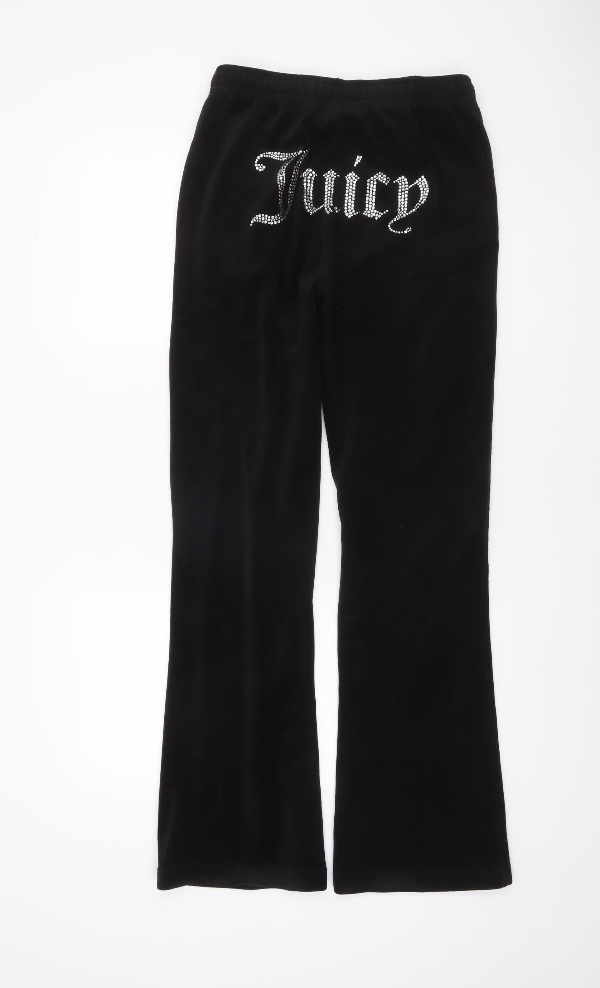 Step into casual luxury with these Juicy Couture black velour jogger trousers — the perfect fusion of comfort and style. Crafted from a soft and plush blend of polyester and elastane, these trousers are designed to offer a flattering silhouette and all-day ease. The signature Juicy Couture branding glitters in rhinestones across the back, bringing a nostalgic early 2000s charm while showcasing the iconic look that made the brand famous for effortless glamour. The mid-rise waistband features an adjustable drawstring for a personalised fit, and practical side pockets add convenience without compromising style. The slightly flared leg design lends a balanced, retro-inspired shape that pairs beautifully with trainers, sliders or even heeled boots for a chic lounge-to-street vibe. Perfect for cooler months, the sumptuous velour fabric keeps you warm and cosy, making these trousers ideal for autumn and winter wear. Whether you’re relaxing at home, travelling in comfort, or heading out with friends, these Juicy Couture joggers add instant style and confidence to any outfit. Pair them with a cropped hoodie for that coordinated Y2K look or dress them up with a fitted tee and leather jacket for a refined casual-edge. Subtle detailing such as the elasticated waist, soft hand-feel, and distinct luxurious texture make these an essential wardrobe staple for those who love both comfort and fashion.These trousers are in excellent pre-loved condition, showing minimal signs of wear with no marks or damage. Designed for women and finished with classic Juicy flair, they embody a timeless appeal that captures both nostalgia and modern comfort effortlessly. A must-have for fashion lovers who value quality and iconic styling, these Juicy Couture joggers are perfect for elevating your everyday casualwear with a touch of LA-inspired glamour.