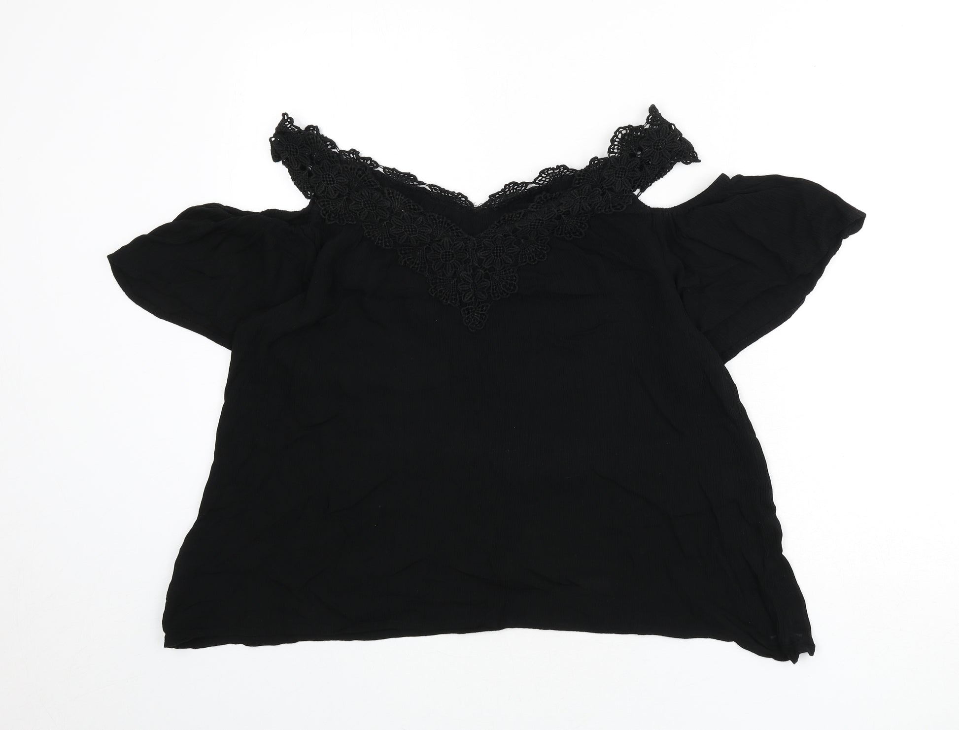 Womens Black Viscose Basic Blouse Size 14 V-Neck - Lace Trim