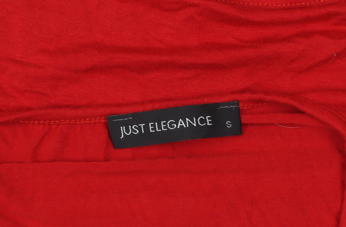 Add a refined pop of colour to your wardrobe with this elegant red short-sleeved top from Just Elegance. Designed for comfort and style, this piece features a soft and breathable viscose blend fabric that offers a flattering drape while maintaining stretch from its subtle elastane composition. The classic scoop neckline is beautifully accented with glistening rhinestones and a charming bow detail that adds a touch of glamour to an otherwise casual silhouette. Perfect for spring and summer wear, the lightweight jersey material ensures you stay comfortable all day whether you’re dressing it up or keeping it casual.This top easily pairs with tailored trousers, jeans, or skirts for a versatile look that transitions effortlessly from day to evening. The pullover design allows for easy wear, while the short fitted sleeves provide a comfortable fit that flatters all shapes. Craftsmanship is evident in the finished seams and softly pleated front, creating a subtle fullness for a more feminine shape. Ideal for casual outings, lunches, or relaxed social events, this piece embodies simple sophistication combined with everyday practicality.In very good pre-loved condition, this item displays only minor signs of creasing, with no noticeable stains or damage. With its timeless design and quality finish, it remains an effortlessly chic addition to any modern wardrobe. Giving you the comfort of jersey softness and the elegance of a thoughtful neckline detail, it’s a wardrobe essential that offers versatile styling and lasting appeal. Machine washable and easy to care for, this red Just Elegance top will quickly become a favourite for adding a stylish yet relaxed touch to your outfit rotation.