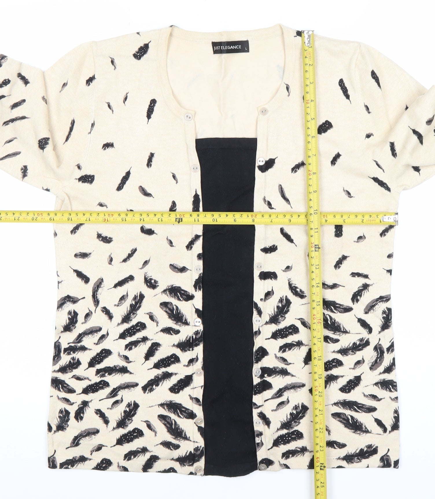 Elevate your wardrobe with this stylish Just Elegance women’s cardigan, designed with both versatility and comfort in mind. Crafted from a soft and lightweight knit blend of viscose and nylon, it ensures a breathable and gentle feel against the skin while maintaining a flattering shape. Featuring a striking black feather print against a beige backdrop, this cardigan creates an effortlessly chic look perfect for layering with your everyday or smart-casual outfits.The classic round neckline and practical button fastening down the front highlight its timeless cardigan style, while the 3/4 length sleeves offer an elegant touch suitable for transitional weather. With its regular fit and lightweight construction, this piece is ideal for wearing throughout spring and autumn, providing just the right amount of coverage without feeling heavy.The nature-inspired feather print adds unique character and a subtle hint of whimsical style, making this cardigan more than just a layering piece – it becomes the focal point of your outfit. Pair it with casual jeans for a relaxed weekend look, or dress it up with tailored trousers or a skirt for a more polished appearance. Whether worn open over a blouse or buttoned-up for a neater silhouette, the design ensures maximum versatility.This cardigan is machine washable, making it as easy to care for as it is to wear. It falls under the ‘Excellent’ pre-owned category, with only light signs of gentle use and no visible flaws, ensuring it remains an attractive and wearable piece for many more seasons to come.Perfect for casual occasions, workwear layering, or simply for adding a stylish twist to your daily wardrobe, this cardigan is a must-have addition. Its beige colour palette makes it easy to pair with a variety of tones, while the feather print adds a distinctive stylish edge. Ready to wear and easy to style, it’s the perfect blend of practicality and fashion to enhance your outfit choices.