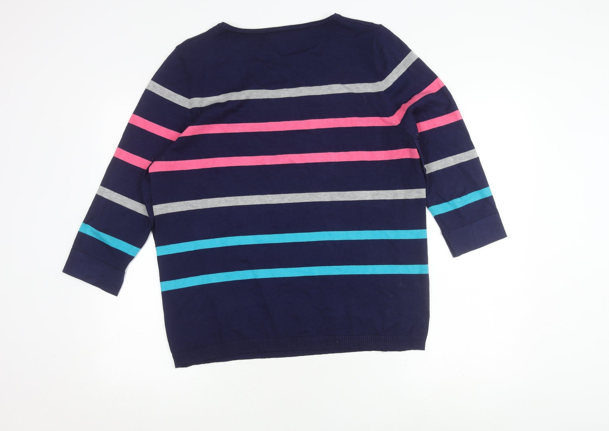 Add a splash of style and comfort to your wardrobe with this Just Elegance women's cardigan. Perfect for the fashion-forward woman, this cardigan comes in a multicoloured striped pattern that gives a vibrant yet chic look. Crafted for optimum comfort, it is constructed from a high-quality blend of 65% viscose and 35% nylon, ensuring a soft, snug feel against your skin. This elegant cardigan features a boat neckline and 3/4 sleeves, making it ideal for layering over a camisole or top. The button accents add a sophisticated touch, while the tight-knit style gives it a refined finish. Designed for regular wear, this piece is suited for both spring and autumn, offering versatility in your wardrobe. It comes in a size large, ensuring a relaxed fit for effortless style. Pair it with your favourite jeans for a casual outing, or style it with a skirt for a fun evening with friends. In excellent condition with no visible wear, this cardigan promises quality and durability. Elevate your ensemble with the Just Elegance striped cardigan and make every day your runway.