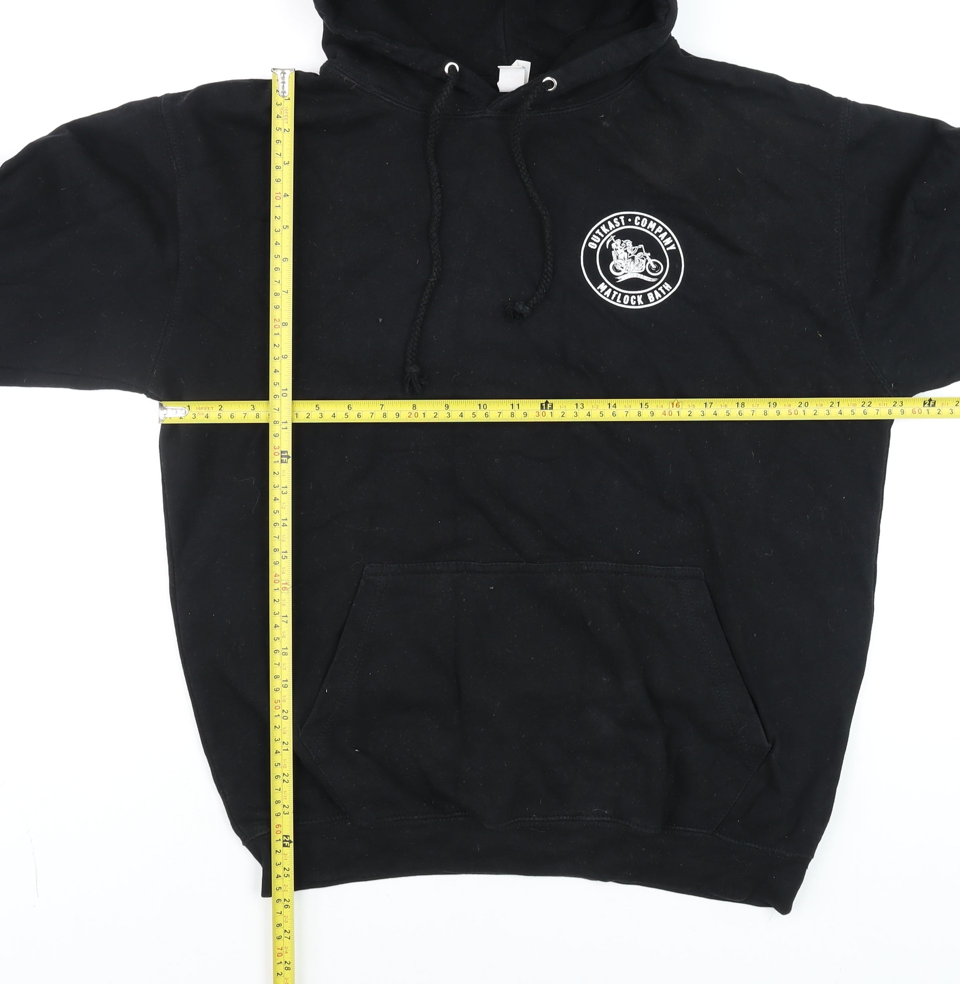 This black pullover hoodie from Just Hoods offers a comfortable and stylish option for casual wear throughout the cooler seasons. Crafted from a soft and durable cotton-polyester fleece blend, it combines warmth with easy care and long-lasting wear. The hoodie features the standout ‘Outkast Company Matlock Bath’ biker-themed logo printed in white on both the front and back, giving it a distinctive and edgy look perfect for motorcycle enthusiasts or anyone who enjoys strong graphic styles.Designed in a regular fit with long sleeves, a front kangaroo pocket, and an adjustable drawstring hood, this hoodie provides functional comfort whether you're layering up for a ride or relaxing on a weekend outing. The fleece fabric provides insulation and breathability, keeping you comfortable across autumn, winter, and spring. Suitable for men who appreciate casual, versatile pieces, it's ideal for everyday wear, outdoor activities, or lounging.The black colourway offers effortless pairing with jeans or joggers, while the clean graphic print ensures it stands out without being overbearing. Made from 80% cotton and 20% polyester, it retains softness and structure even after regular washing. Machine washable for easy garment care, this hoodie keeps its shape and finish when cared for as directed.In very good pre-owned condition, it shows only light signs of previous wear, typical of gentle use, with minor lint visible on the surface. The material remains soft and vibrant, with no major flaws noted. Offering comfortable wear and bold style, this Just Hoods biker hoodie presents excellent value for money at an affordable price point.Ideal for men who appreciate relaxed and durable everyday clothing, this hoodie’s combination of functionality, comfort, and character makes it a reliable go-to choice for both casual outings and leisure wear. Add a touch of biker-inspired edge to your wardrobe with this stylish, easy-care pullover hoodie.