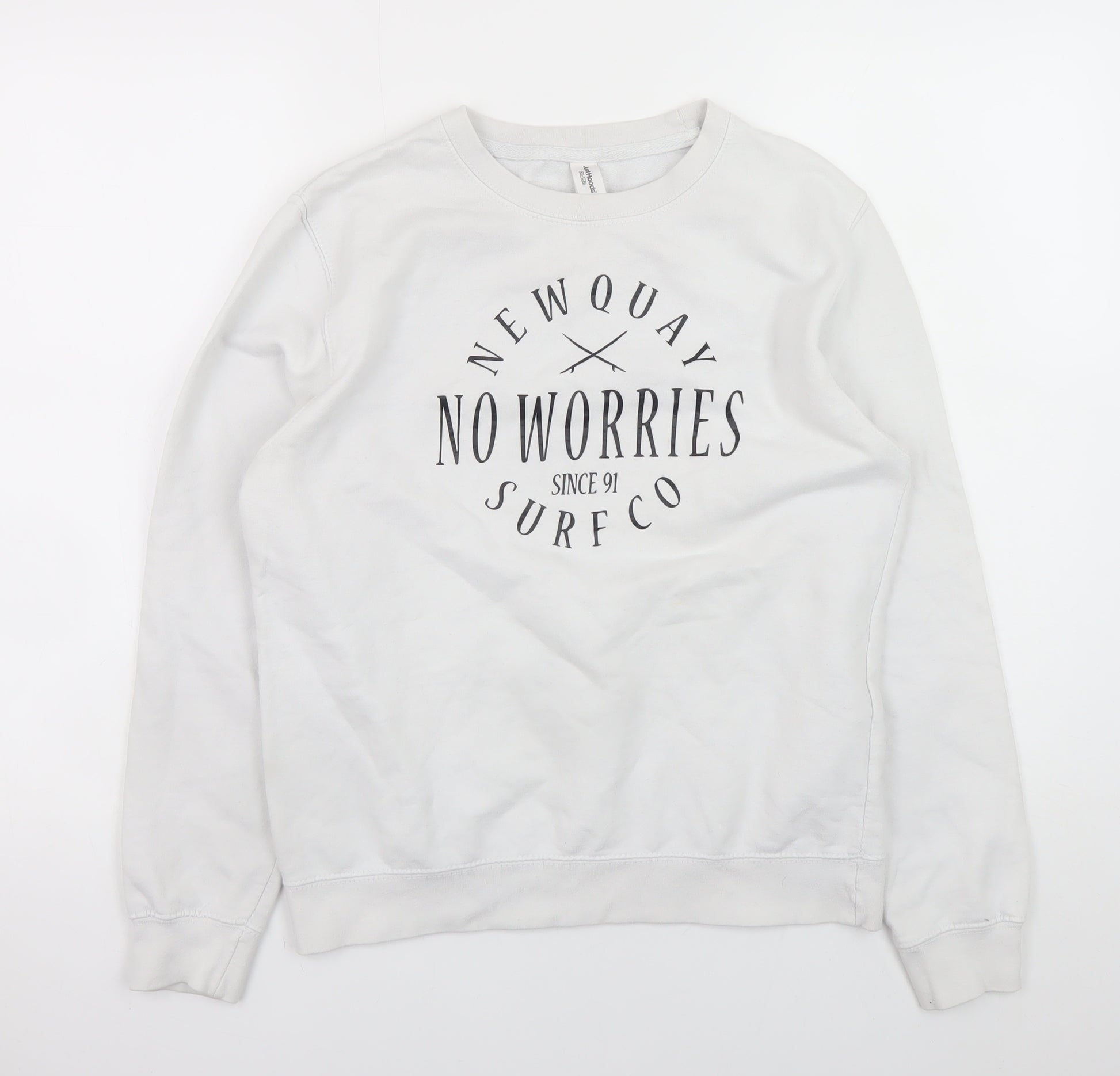 Bring laid-back coastal vibes to your wardrobe with this women’s JustHoods AWDIS pullover sweatshirt. Crafted in a classic white shade, it features the bold 'Newquay No Worries Surf Co.' logo graphic printed on the front, capturing effortless surf-inspired style perfect for everyday casual wear. Designed in a relaxed, regular fit, this XS size sweatshirt combines timeless comfort with a modern edge, making it a versatile choice for layering through the changing seasons. The soft fleece fabric, made from an 80% cotton and 20% polyester blend, ensures a cosy yet breathable feel that’s ideal for autumn walks, spring outings, or simply lounging in comfort. The crew neckline and ribbed cuffs add a structured touch while maintaining a casual look that pairs perfectly with jeans or shorts. Whether exploring beach towns or relaxing at home, this top offers both comfort and personality. Despite minor light markings on the back sleeve, the sweatshirt remains in very good overall condition, maintaining its quality and style. Easy to care for and machine washable, it’s a practical staple designed for regular wear. Give your outfit a relaxed surf-inspired flair with this JustHoods women's sweatshirt — a comfy, easy-going top that captures the carefree spirit of coastal living. Ideal for casual outings, weekend wear, or layering over your favourite vest, it’s the perfect combination of comfort, simplicity, and surfer chic. Add this timeless piece to your collection today and enjoy its reliable fit and understated beachside charm all year round.
