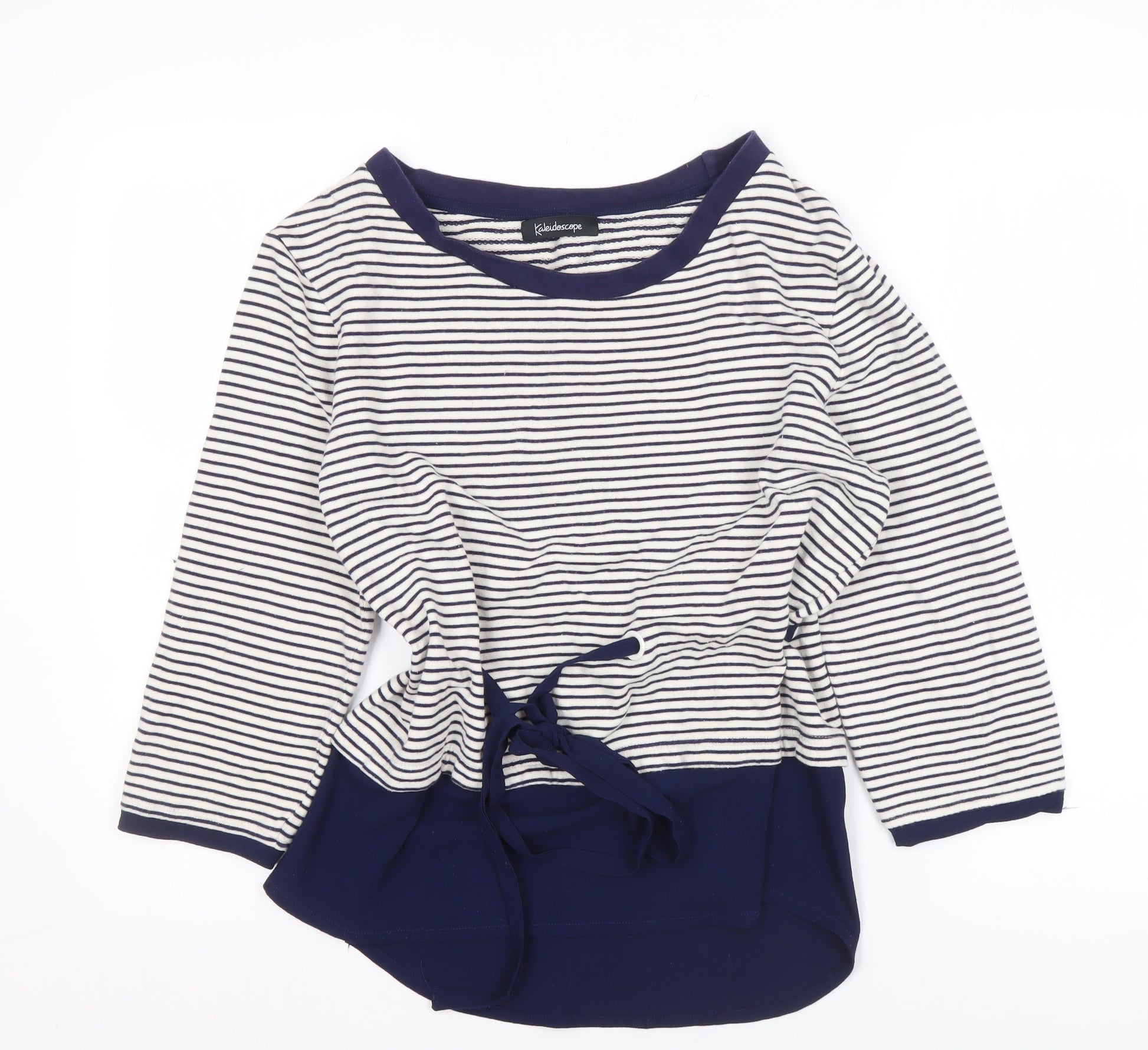 Elevate your wardrobe with this stylish women's striped top from Kaleidoscope. Designed for both comfort and elegance, this top features a boat neck that adds a touch of sophistication to your ensemble. The 3/4 sleeves provide versatility, making it suitable for both warm and transitional weather. Constructed from 100% cotton for the shell and complemented by 100% polyester bottom trim, this top offers a breathable and soft feel against the skin. Its classic navy and white striped pattern brings a nautical flair, perfect for casual outings or meet-ups. The regular fit ensures enough room for movement while maintaining a flattering silhouette. Ideal for pairing with jeans or skirts, this top is a fantastic addition to any casual wardrobe. Whether you're heading to a casual brunch or a walk by the seaside, this Kaleidoscope top brings effortless style. Durable and chic, it's the go-to piece for endless styling possibilities. Don't miss the chance to make it yours. Perfect for women seeking a classic yet contemporary piece, this top promises to become your next favourite staple.